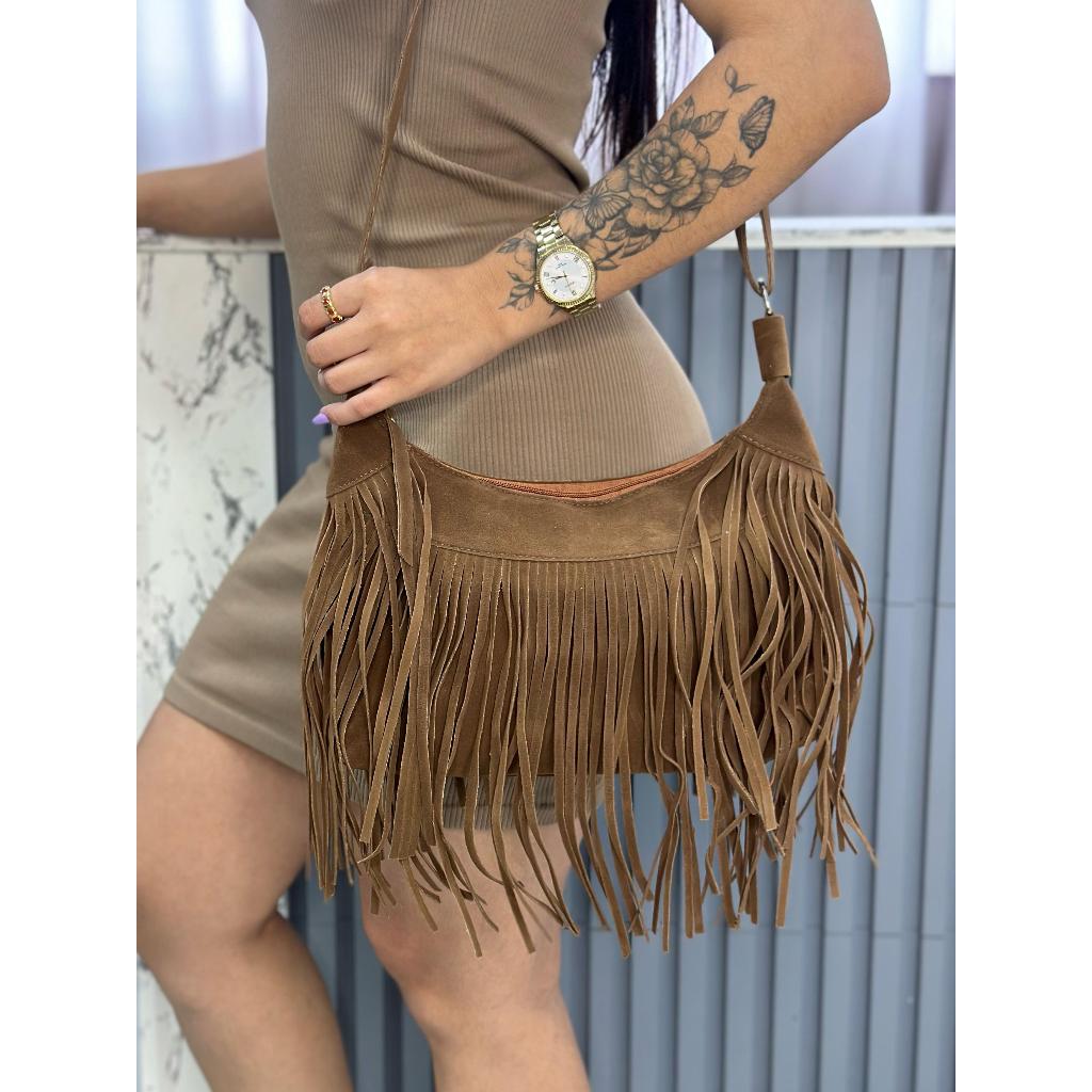 Bolsa feminina franja de ombro e transversal boho chick camurça lançamento
