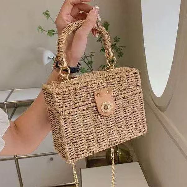 Bolsa feminina palha caixinha de praia trançado alça de mão alça corrente cadeia transversal