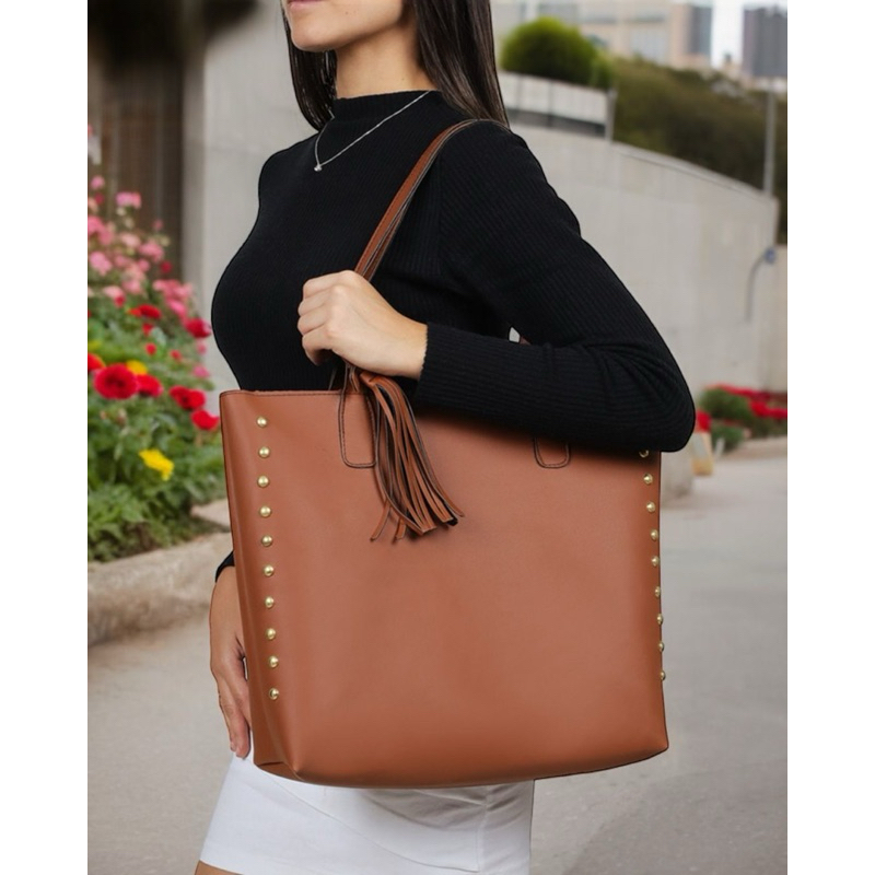 Com Envio Imediato 🚀🤍✨ A Nossa Bolsa de ombro modelo Shopper é perfeita para o trabalho e o dia a dia, unindo praticidade e estilo em um só acessório. Com design sofisticado e aplicações laterais douradas, traz um toque elegante e moderno à sua produção. O pingente de franja complementa o visual com charme e movimento, enquanto o fechamento em ímã garante praticidade e segurança no uso. A bolsa não possui forro, proporcionando leveza e um acabamento interno clean e contemporâneo. Medidas: Altura: 32 cm Largura: 39 cm Uma bolsa versátil, espaçosa e atemporal — ideal para acompanhar você em todos os momentos.