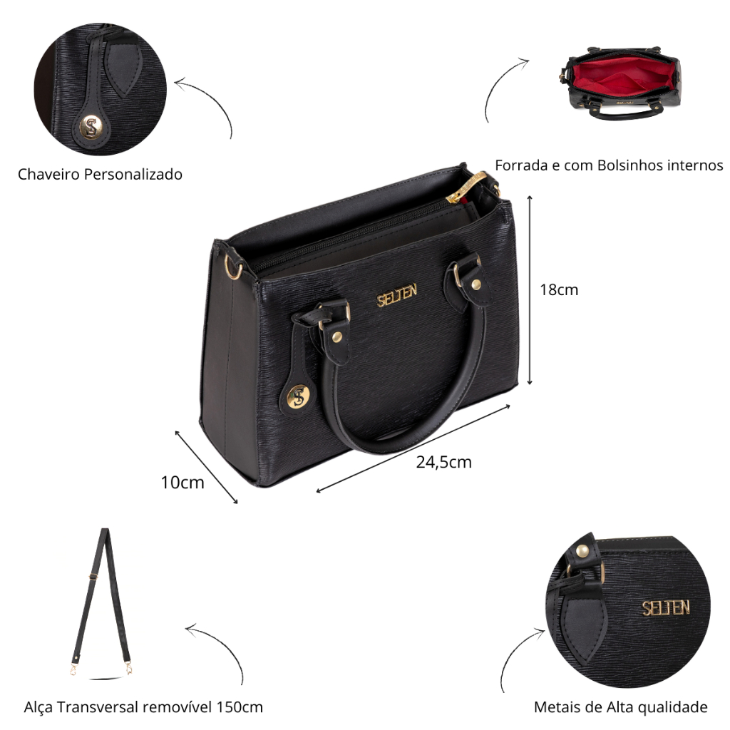Com um design clássico e sofisticado, essa bolsa traz o equilíbrio ideal entre modernidade e atemporalidade. O acabamento texturizado confere um toque refinado, enquanto os metais dourados dão aquele charme extra que faz toda a diferença. Compacta por fora, mas surpreendentemente espaçosa por dentro, ela acompanha você com estilo em qualquer ocasião. Seja para um dia corrido de compromissos ou um jantar especial, essa bolsa é a escolha perfeita para quem não abre mão de praticidade sem deixar o glamour de lado. Além disso, acompanha uma alça removível e ajustável que pode ser usada tanto de modo lateral como transversal. Medidas (Largura, altura e profundidade): 24,5x18x10 Características do produto: Material Externo: Sintético Material Interno: Têxtil Tamanho: Médio Fecho: Zíper Garantia de 30 dias. Todas as fotos são reais.