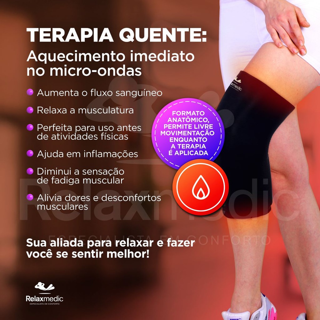 LANÇAMENTO | LOJA OFICIAL | PRONTA ENTREGA | TODAS AS FOTOS SÃO REAIS DO PRODUTO | ENVIO PARA TODO BRASIL | 30 ANOS NO MERCADO | 1 ANO DE GARANTIA | ASSISTÊNCIA TÉCNICA PRÓPRIA Bolsa Térmica Gel Multifuncional Grande: conforto e alívio para todas as partes do corpo Destaques do Produto: Design anatômico e versátil: Cobertura 360° que se ajusta perfeitamente a áreas como braços, cotovelos, pernas, joelhos, tornozelos e pés. Terapia quente e fria: Ideal para aliviar dores, inflamações e tensões musculares de maneira eficaz e prática. Tecido premium: Toque macio e suave, confortável até para peles sensíveis. Modo de Uso: Compressa fria: Resfrie no freezer por 2 horas para reduzir inchaços e tratar lesões recentes. Compressa quente: Aqueça no micro-ondas por 40 segundos para relaxar músculos e aliviar desconfortos. Benefícios: Alívio imediato para lesões esportivas, dores crônicas e tensões do dia a dia. Flexível e reutilizável, proporcionando conforto e praticidade em diversas situações. Distribuição uniforme de calor ou frio para ação eficaz na área tratada. Detalhes Técnicos: Dimensões: 36 x 27,5 cm Peso: 0,850 kg Composição: Tecido nylon, gel líquido Garantia: 3 meses Por que Relaxmedic? Perguntas Frequentes: É adequado para diferentes partes do corpo? Sim, é projetado para braços, cotovelos, pernas, joelhos, tornozelos e pés. É original? Sim, garantimos a autenticidade como loja oficial da Relaxmedic. Tem garantia? Sim, 3 meses de garantia com suporte técnico exclusivo. Sobre a Relaxmedic: Com 30 anos no mercado, a Relaxmedic combina tecnologia, conforto e responsabilidade ambiental. Parceira do projeto Eu Reciclo, garante a reciclagem de embalagens. Todos os produtos são testados e certificados (Anvisa, Inmetro, Anatel), priorizando qualidade e segurança.