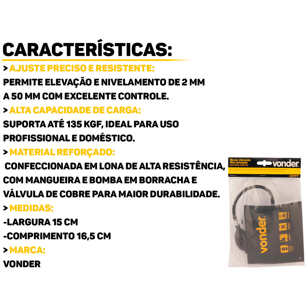 Bolsa Inflável Multifunção Vonder A Bolsa Inflável Multifunção Vonder é a ferramenta ideal para profissionais de funilaria, vidraceiros, instaladores e mecânicos que buscam praticidade e precisão nos ajustes. Produzida em lona reforçada, trabalha com ajustes de 2mm até 50mm, suportando até 135kg. É compacta, facilita o transporte e o manuseio em locais de difícil acesso. Características: > Suporta até 135kg; > Produzida em lona reforçada; > Trabalha com ajustes de 2mm até 50mm; > Indicada para instalações, alinhamentos e abertura de portas e janelas residenciais e automotivas, também sendo muito usada em reparos de funilarias (martelinho de ouro) e atividades domésticas em geral. Especificações Técnicas: > Material da bolsa: lona; > Material da válvula: cobre; > Espaço de ajuste: 2mm a 50mm; > Capacidade máxima de carga: 135kg; > Material da bomba e da mangueira de enchimento: borracha. - Marca: Vonder - Garantia: 90 dias contra defeitos de fabricação Vantagens de comprar na Brester: - Produto a pronta entrega. - Produto novo, com garantia de fábrica. - Nota fiscal para Pessoa Física e Pessoa Jurídica.