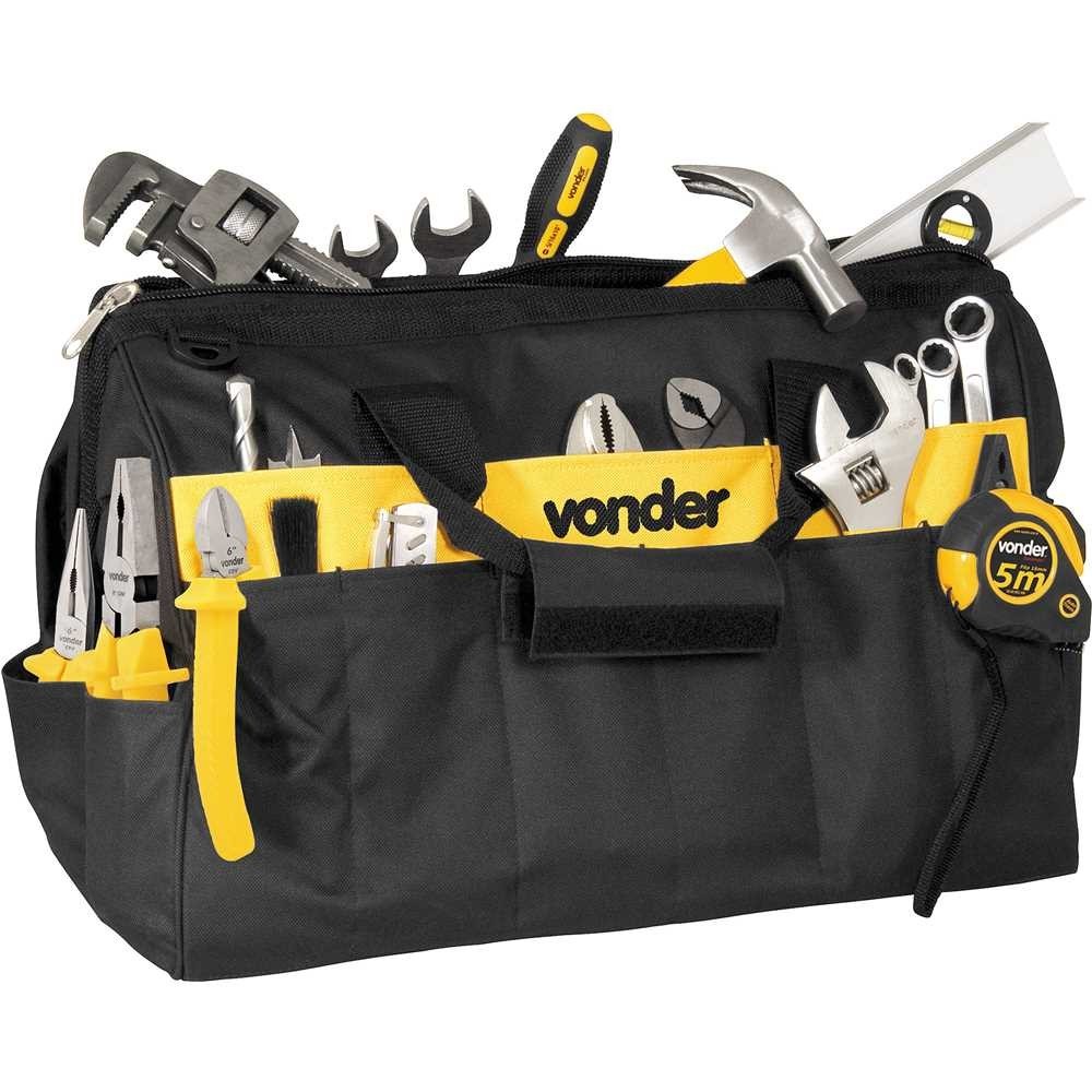 Bolsa em lona para ferramentas, 47,0 cm x 30,0 cm x 35,0 cm, BL 008, VONDER. Confeccionada em lona reforçada com abertura total, reforço metálico na parte superior, alça fixa e alça auxiliar em nylon,possui 4 pés/apoios plásticos, ziper extra reforçado e 36 divisões/bolsos sendo 10 na parte interna e 26 na parte externa. Indicada para acondicionamento de ferramentas e acessórios em geral. Modelo: BL 008 Comprimento: 47,0 cm Largura: 30,0 cm Altura: 35,0 cm Material (tipo/composição): Lona Capacidade máxima de carga (kgf): 15,0 kgf Massa aproximada (peso) (kg): 1,485 kg Conteúdo da Embalagem: 1 Bolsa.