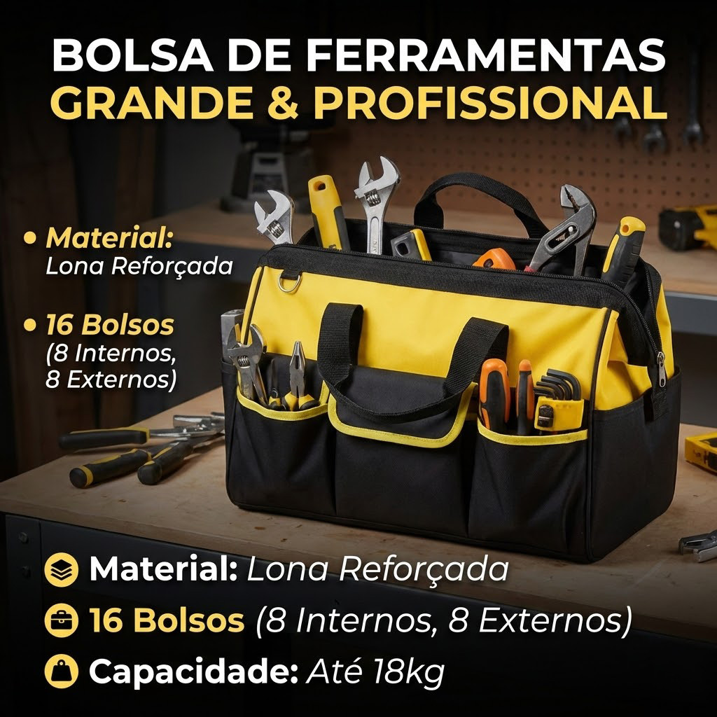 Bolsa Mala Ferramenta Grande Fundo Reforçado Mochila Lona Reforçado 45cm Profissional Resistente Carpinteiro Eletricista Pintor Pedreiro Epi Tippi A Bolsa de Ferramentas Grande Reforçada para Eletricista é ideal para profissionais que exigem praticidade, organização e durabilidade. Confeccionada em poliéster de alta resistência, ela suporta até 18 kg de carga e oferece 16 bolsos estratégicos, sendo 8 internos e 8 externos, garantindo amplo espaço e fácil acesso às ferramentas. Seu design robusto, aliado ao fundo rígido, proporciona estabilidade em qualquer ambiente de trabalho. Com alças resistentes e estrutura reforçada, esta bolsa é perfeita para eletricistas, carpinteiros e profissionais que atuam em campo, oferecendo mobilidade sem abrir mão da segurança. Suas dimensões compactas de 45 cm de comprimento, 30 cm de altura e 25 cm de largura facilitam o transporte sem comprometer a capacidade. Seja em obras, reformas ou manutenções, essa bolsa oferece a resistência e o espaço que você precisa para executar seus serviços com eficiência e organização. Especificações Técnicas: • Material: Poliéster reforçado • Capacidade de carga: Até 18 kg • Compartimentos: 16 bolsos (8 internos e 8 externos) • Fundo: Rígido e resistente • Uso: Profissional, ideal para eletricistas, carpinteiros e técnicos Dimensões: • Comprimento: 45 cm • Altura: 30 cm • Largura: 25 cm FAQ – Perguntas Frequentes: 1. A bolsa tem estrutura firme? Sim, o fundo é rígido e a estrutura reforçada garante estabilidade mesmo com peso. 2. Quantos bolsos ela possui? Possui 16 bolsos no total, sendo 8 internos e 8 externos. 3. Suporta ferramentas pesadas? Sim, ela suporta até 18 kg de ferramentas. 5. É resistente à água? O tecido é resistente a respingos leves, mas não é impermeável. Conteúdo da embalagem: • 01 Bolsa de Ferramentas Reforçada Importante: Valor Unitário Imagens Meramente Ilustrativas Não nos responsabilizamos pelo mau uso do produto