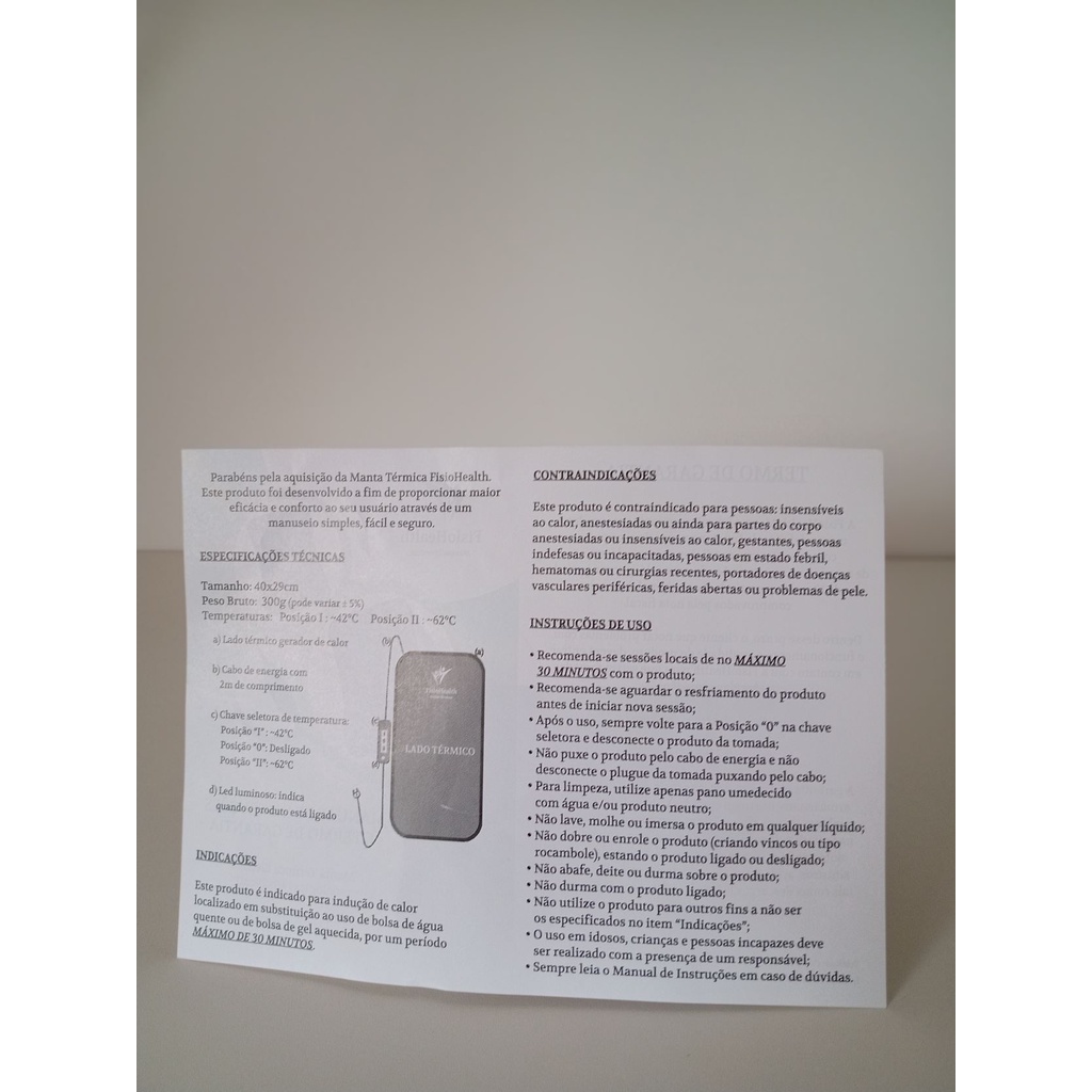 Manta Térmica A Manta Térmica FisioHealth é o produto ideal para a realização de terapias que necessitam da emissão contínua de calor (termoterapia). Possui as duas temperaturas mais utilizadas no mercado para a realização de tratamentos fisioterápicos, estéticos e também para o alívio de dores. Desenvolvida em material maleável, porém resistente e de fácil higienização, se adequa confortavelmente a anatomia do seu corpo. Modelo disponível na versão 127V. Altura*: 40 cm Largura*: 29cm Consumo*: 40w (max.) Peso Bruto*: 300g *Valores aproximados FISIOTERAPIA Redução de espasmo muscular, diminuição da rigidez articular, aumento de flexibilidade, etc. ESTÉTICA Aceleração do metabolismo basal, liberação de toxinas através da sudorese, além de potencializar a penetração de ativos cosméticos na derme. ALÍVIO DA DOR Redução de dores agudas e crônicas, tais como entorses, lombalgias, cólicas menstruais e gastrointestinais, contusões, artroses, etc. Desde já agradeço pela atenção e preferência!!!