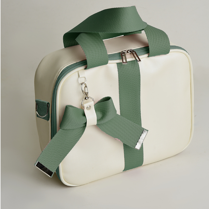 ✨ Detalhes do Produto: Confeccionada em tecido externo Factor resistente Forro interno em Lamicel, fácil de limpar Alças, faixas e chaveiro em fita chic Design moderno com laço decorativo exclusivo 📏 Medidas da Bolsa: Altura: 24 cm Largura: 11 cm Comprimento: 29 cm 💎 Diferenciais: Compacta, leve e prática para o dia a dia Ideal para maternidade, passeios e consultas Combina elegância, durabilidade e funcionalidade Acabamento sofisticado que garante estilo em qualquer ocasião