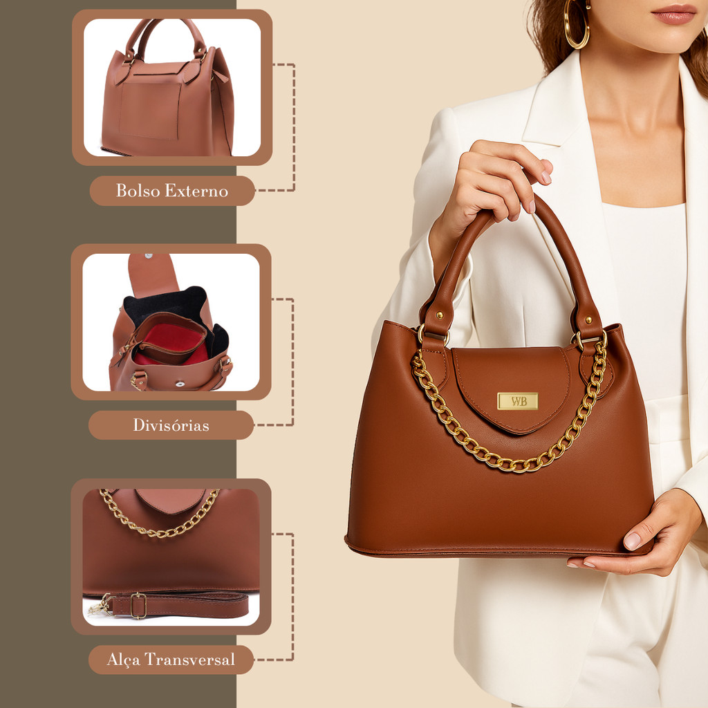 Bolsa Média feminina detalhes de corrente com alça transversal e bolso externo