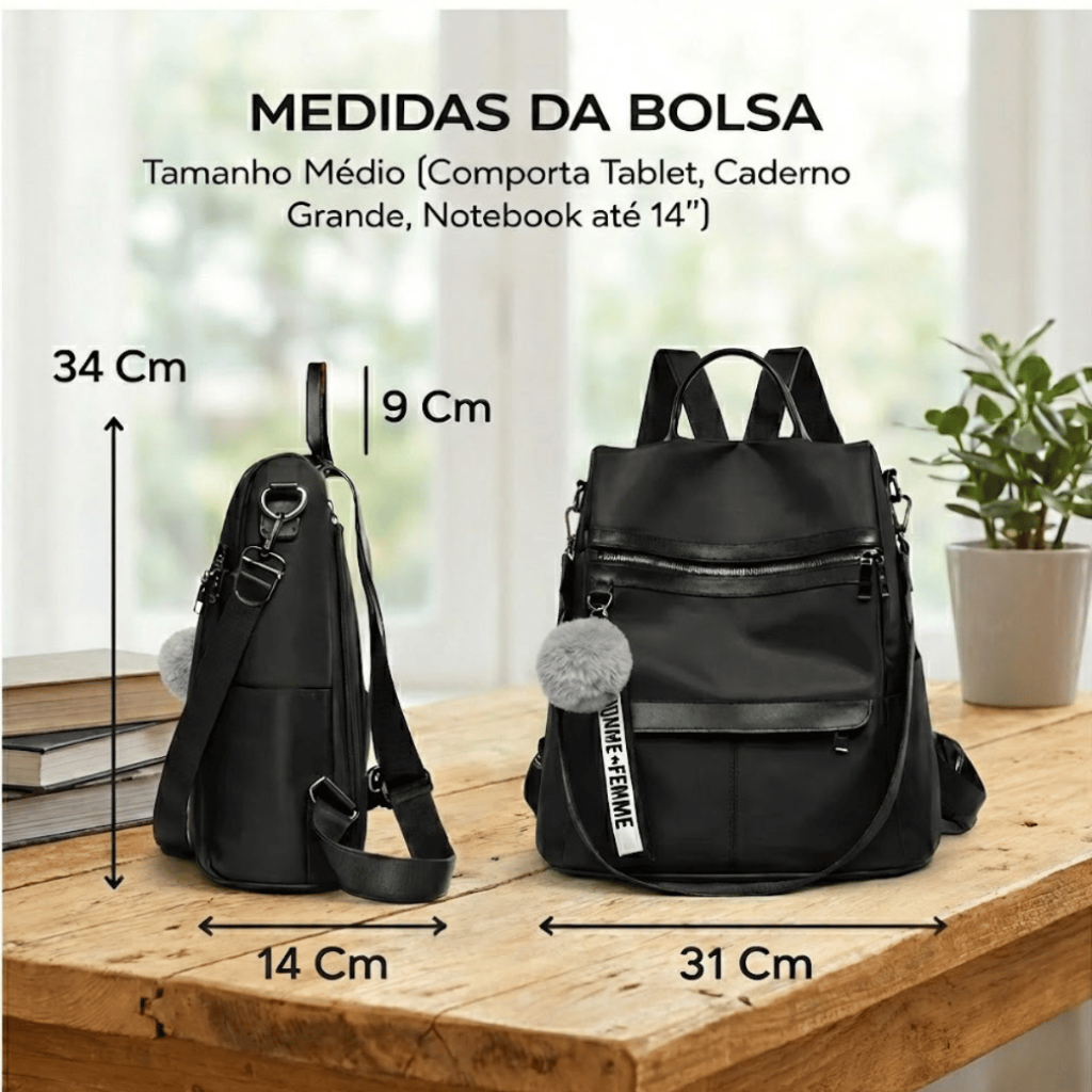 Mochila Feminina Antifurto Resistente à Água Bolsa Transversal Notebook 14 Polegadas Tecido Oxford Premium Passeio Trabalho Faculdade Descrição do Produto. Segurança e Elegância em um Único Produto A Mochila Feminina Antifurto é a escolha ideal para mulheres que buscam proteção e estilo na rotina urbana. Com um design inteligente e minimalista, este modelo foi desenvolvido para oferecer máxima segurança em transportes públicos, viagens e locais movimentados. Diferenciais de Segurança (Sistema Antifurto) O grande diferencial desta mochila é a sua abertura principal posicionada na parte de trás (nas costas). Isso impede que qualquer pessoa acesse seus pertences enquanto você a carrega, garantindo total tranquilidade durante o trajeto. Material Premium e Resistência Fabricada em tecido Oxford de alta densidade, a mochila possui acabamento semi-impermeável. O material é resistente a respingos e chuvas leves, protegendo seus eletrônicos e documentos. Além disso, o tecido é fácil de limpar e apresenta alta durabilidade contra o desgaste diário. Versatilidade 2 em 1 Este modelo acompanha uma alça de ombro removível, permitindo que você a utilize de duas formas: Como mochila de costas tradicional. Como bolsa de ombro/transversal elegante para ocasiões mais casuais ou passeios. Espaço Interno e Organização Apesar do design compacto, o espaço interno é otimizado para comportar: Notebook de até 14 polegadas ou Tablet/iPad. [Imagem 3] Cadernos grandes, livros e agendas. Sombrinha, garrafa de água e maquiagens. Bolsos laterais externos para itens de acesso rápido. Especificações Técnicas Material: Tecido Oxford / Nylon Premium. Dimensões: 34 cm (Altura) x 31 cm (Largura) x 14 cm (Profundidade). [Imagem 3] Peso Aproximado: 400g. Alças: Reguláveis e reforçadas. Acessório: Acompanha chaveiro pompom removível. [Image 5] Conteúdo da Embalagem 01 Mochila Feminina Antifurto. 01 Alça de ombro removível. 01 Chaveiro Pompom. Por que escolher este modelo? Diferente de mochilas comuns, este modelo une a funcionalidade de uma bolsa de trabalho com a segurança necessária para quem vive em grandes centros urbanos. O acabamento em metal niquelado e o tecido de toque macio conferem um aspecto sofisticado que combina com diversos looks, do executivo ao casual. Observações Importantes: As cores podem sofrer pequenas variações de tonalidade dependendo da tela do seu dispositivo. Verifique as medidas antes de confirmar a compra para garantir que o produto atende às suas necessidades de espaço.