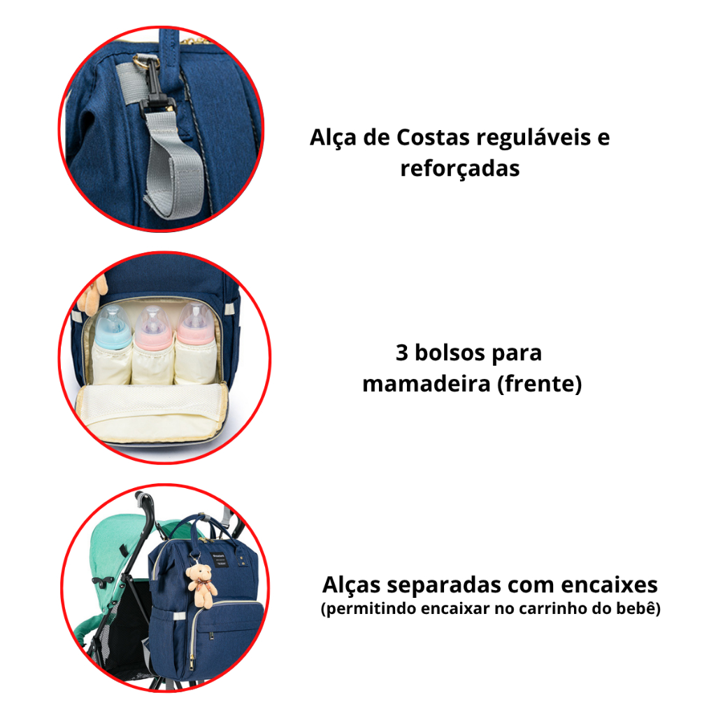 BOLSA MOCHILA MATERNIDADE MADAMI Características: •Confeccionada em tecido 100% Oxford de alta resistência •Alça de Costas reguláveis e reforçadas •Alças separadas com encaixes, permitindo encaixar no carrinho do bebê •Tratamento interno antibacteriano •6 x bolsos de armazenamento (interior) •3 x bolsos para mamadeira (frente) •1 x bolso porta lenço umedecido (lateral) •1 x bolso para garrafa de água (lateral) Especificações: • Marca: Madami • Material: 100% Poliéster de alta resistência • Medidas (Altura x Largura x Profundidade): 40x25x17cm • Peso: 0,835gm • Capacidade: 17 L • SKU: MD2019Z Conservação: Limpeza com pano úmido, sem produtos químicos. Não expor ao sol. Garantia: 3 meses para defeitos de fabricação Pronta entrega | Nota Fiscal | Produto original