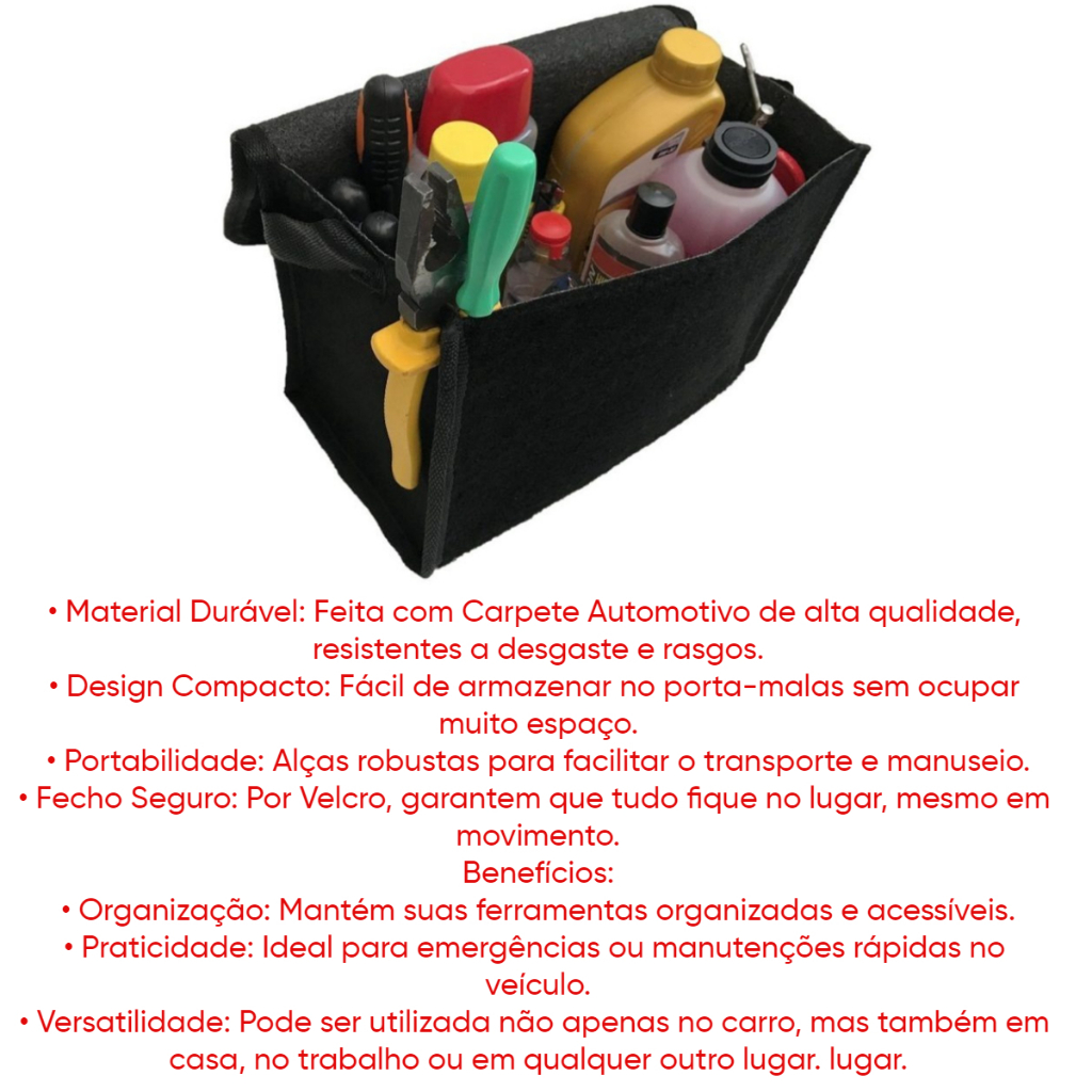 Bolsa Automotiva Organizadora de Carpete Premium A Bolsa Automotiva é o acessório essencial para manter o seu carro organizado, nela você consegue guardar ferramentas, mini compressor de ar, óleo, aditivo, lanterna, kit primeiros socorros etc. A bolsa é feita de maneira artesanal, construída em carpete preto, um material premium similar aos carros importados. O símbolo é bordado na mesma nomenclatura e cores fiéis a marca para combinar com o seu veículo. Conta com um velcro na parte traseira para fixar a bolsa no porta-malas, assim ela fica fixa quando o carro está em movimento. CARACTETRISTICAS: - Ideal para manter o seu carro organizado, dá para guardar bastante coisa na bolsa. - Confeccionada em carpete premium na cor preta - Símbolo bordado com a nomenclatura e cores fiéis a marca - Possui Velcro na parte traseira para fixar a bolsa no carpete do porta-malas - Tamanho: 25 x 14 x 30 Cm (Altura x Largura x Comprimento) - Caso queira, pode ser lavada sem problemas ITENS INCLUSOS: - 01 Bolsa Organizadora Para Carro _ O cliente tem a opção no ato de sua compra , de escolher a marca determinada Opções de venda . ** TEMOS DIVERSOS ACESSÓRIOS, PEÇA O LINK! SEJA BEM VINDO(A)