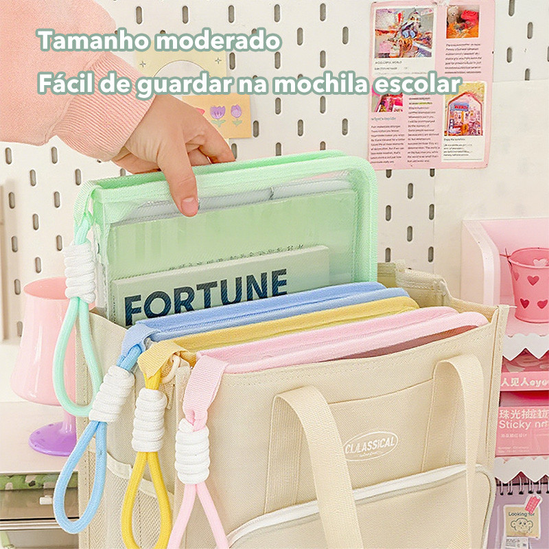📋 Descrição do Produto Organize seus cadernos, papéis, canetas e acessórios com estilo e praticidade! 🎨✨ Nossa pasta de malha transparente é ideal para quem busca funcionalidade e charme em um único produto. Feita com tecido resistente e durável, ela permite visualizar o conteúdo sem precisar abrir, economizando tempo no dia a dia. 💪 Principais Vantagens ✅ Malha Transparente e Resistente: Tecido de alta qualidade que não rasga facilmente, garantindo durabilidade prolongada. ✅ Alça Extra Reforçada: Design ergonômico para transporte confortável, ideal para levar na mochila ou na mão. ✅ Zíper Resistente: Fechamento seguro que mantém seus itens protegidos e organizados. ✅ Bracadeira de Placa Integrada: Funcionalidade extra para fixar cartões, crachás ou etiquetas de identificação. ✅ Cores Pastel Lindas: Escolha entre Rosa, Azul, Amarelo e Verde para combinar com seu estilo pessoal. ✅ Tamanho Perfeito: Acomoda documentos A4, cadernos, canetas e outros acessórios com facilidade. 🎯 Para Quem É Ideal? 🧑🎓 Estudantes: Organize materiais escolares e leve para a escola ou universidade. 💼 Profissionais: Guarde papéis, agendas e acessórios de trabalho com praticidade. ✈️ Viajantes: Mantenha documentos importantes e pequenos itens organizados durante viagens. 🎒 Amantes da Organização: Tenha tudo no lugar e evite bagunça em casa ou no escritório. 🛠️ Detalhes Técnicos Material: Malha de poliéster resistente Cores Disponíveis: Rosa | Azul | Amarelo | Verde Tamanho: 34 cm x 24 cm (acomoda A4) Peso: Aprox. 80g Bolsa escolar transparente,Pasta para escola,Material escolar