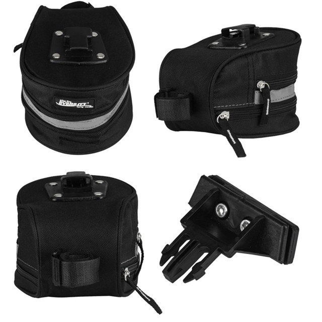 Marca: Everest Modelo: BS91161 Cor: Preta Faixa reflexiva Engate rápido Comprimento: 170mm Largura: 120mm Altura:110m Com detalhes refletivos para visibilidade noturna Sistema de fixação por velcro no canote e engate rápido no selim Peso aproximado: 210g
