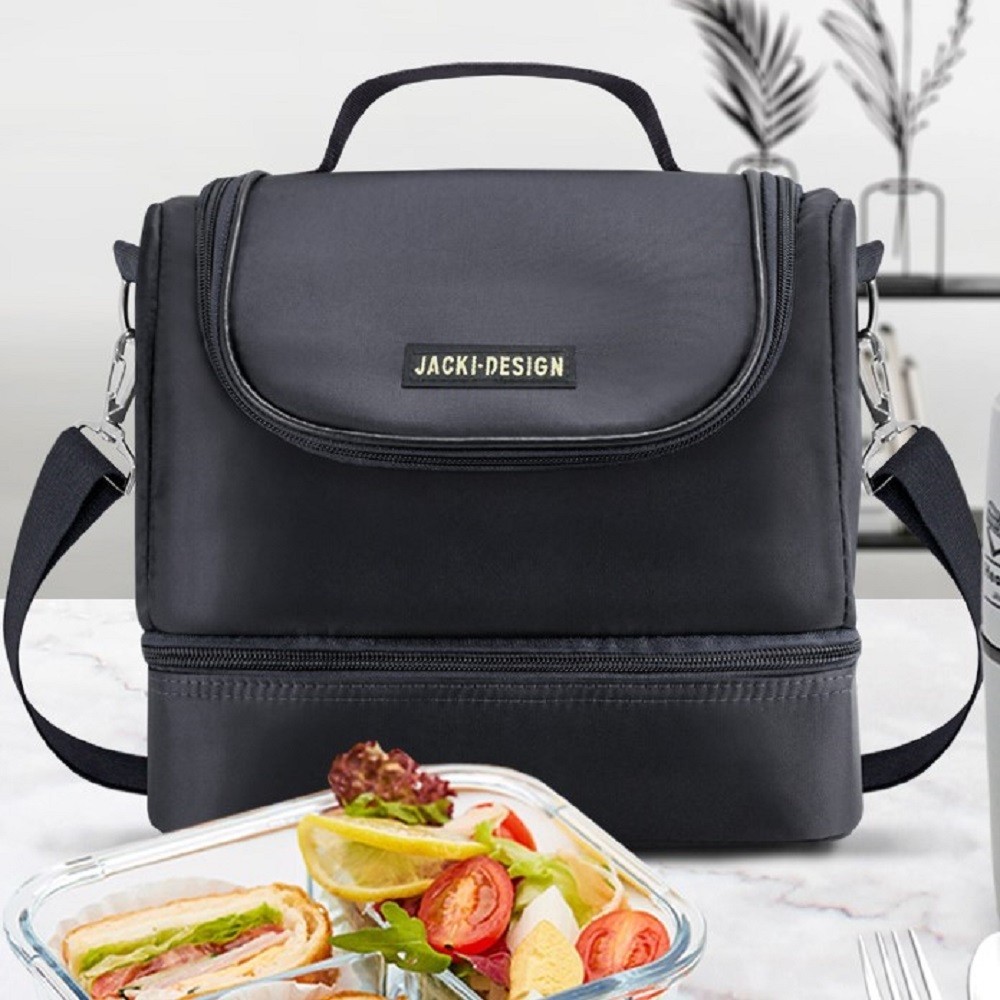 A bolsa térmica com 2 compartimentos da Jacki Design é feita multicamadas e folha de alumínio para manter seu alimento fresco e bem conservado. Possui 2 compartimentos, fecho de zíper e alça lateral removível. A coleção Essencial é discreta e sofisticada! CUIDADOS GERAIS: Limpe a bolsa térmica com um pano úmido. Caso necessário, use sabão neutro ou álcool para higienizar o local. Deixe secar na sombra. ATENÇÃO: Para preservar a vida útil do produto, recomendamos não deixar a bolsa de molho, não levar a máquina de lavar e também não utilizar produtos químicos. Medidas: Comprimento: 23cm x Largura: 14cm x Altura: 19,5cm Material: Poliéster/Folha de Alumínio