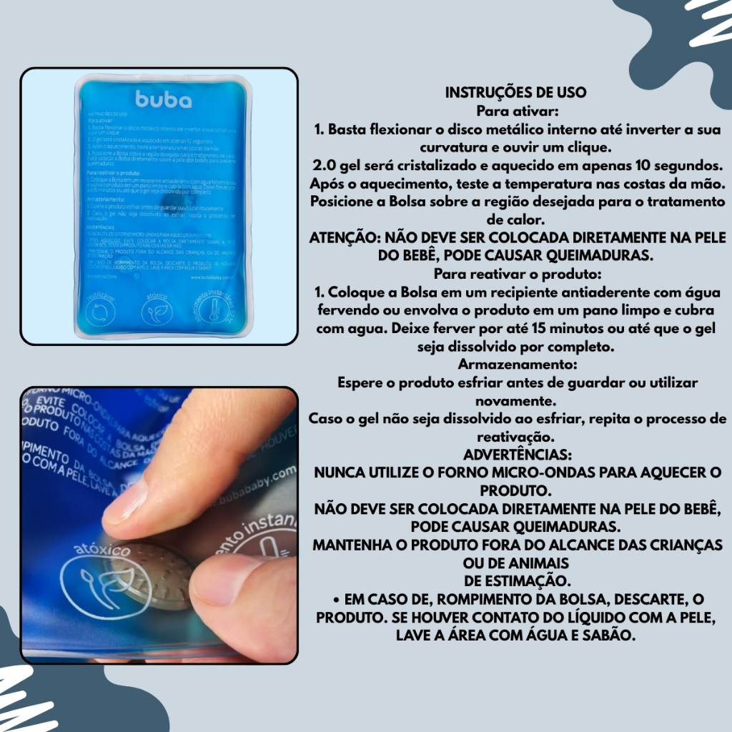 DESCRIÇÃO DO PRODUTO A bolsa de gel de calor instantâneo da Buba é perfeita para uso em tratamento terapêutico. Através do calor gerado instantaneamente por uma reação química, você poderá realizar aplicações de calor por até 30 minutos, moldando facilmente a bolsa de gel no corpo do bebê , proporcionando alívio nas cólicas do seu bebê e em adultos para processos inflamatórios, lesões nos músculos, tendões e articulações, cólicas, hematomas e torcicolos. A terapia com calor está associada ao conforto e relaxamento. O calor melhora a mobilidade e elasticidade, além de ativar a circulação sanguínea, auxiliando no tratamento de doenças inflamatórias. Pode ajudar no alívio de enxaquecas, dores de ouvido, torcicolos, dores na coluna, cólicas, lesões musculares (entorses, contusões, distensões e contraturas), e dor nos joelhos e pernas. CARACTERÍSTICAS TÉCNICAS Conteúdo da Embalagem: 1 bolsa térmica. Dimensões Aproximada Do Produto:15 x 1 x 10 cm (Altura x Largura x Comprimento/Profundidade) Dimensões da Aproximadas da Embalagem: 11 x 2 x 19 cm (Altura x Largura x Comprimento/Profundidade)