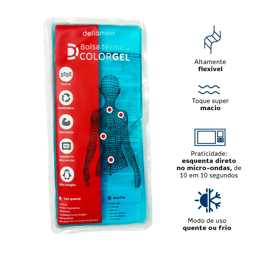 A Bolsa Térmica em Gel ColorGel Dellamed é perfeita para terapia quente e fria, ajudando a aliviar dores musculares, contusões e tensões do dia a dia de forma prática e segura. Diferenciais: Uso quente ou frio: ideal para aplicação em dores musculares, inflamações, contusões ou para relaxamento. Gel que não congela totalmente: mantém flexibilidade mesmo no frio, moldando-se ao corpo. Aquecimento direto no micro-ondas: sem necessidade de pano úmido ou água. Material externo em PVC: toque macio, protege a pele e é fácil de higienizar. Disponível em dois tamanhos: adapta-se a diferentes regiões do corpo. Display prático para organização em casa ou para revenda. Características: Tipos de terapia: Quente e fria. Temperatura de uso: Frio: até 10°C após 30 min. Quente: até 55°C, mínimo 40°C após 30 min. Material externo: PVC resistente e macio. Material interno: Gel (água, glicerina, carboximetilcelulose de sódio, ureia e conservantes). Flexível: molda-se ao contorno do corpo. Especificações Técnicas: Validade: 4 anos Cores: gel azul, embalagem vermelho com detalhes em preto e branco Dimensões Tamanho P: 180 ml Altura: 18cm Largura: 13cm Peso: 0,180 gramas Dimensões Tamanho M: 320 ml Altura: 25cm Largura: 12,5cm Peso: 0,320 gramas Garantia: 3 meses de garantia contra defeitos de fabricação.