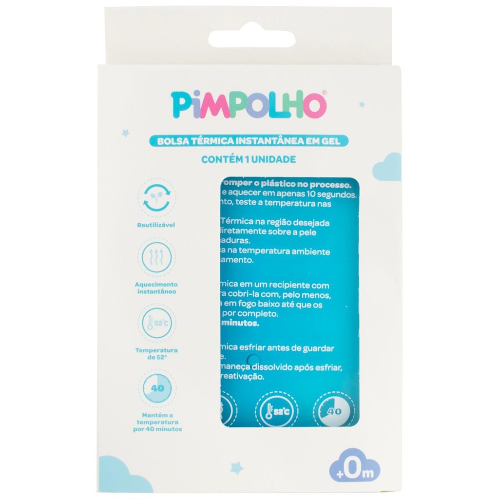 Bolsa Térmica Instantânea Em Gel Unissex Pimpolho Cor: Azul Características: A bolsa térmica instantânea em gel da Pimpolho é a opção mais prática e fácil para o alívio de dores ou cólicas dos bebês. Sua ativação de calor pode ser feita em qualquer lugar sem grandes dificuldades. Com apenas um clique no botão interno o gel é cristalizado e passa a esquentar podendo manter a bolsa aquecida em até 40 minutos dependendo da temperatura ambiente. Para os cristais voltarem ao seu estado líquido basta manter a bolsa em água fervente até os cristais dissolverem por completo. ATENÇÃO: Não ultrapassar 10 minutos em água fervente. Acompanhe as instruções de uso e conservação estampada na embalagem. Conservação: Examine regularmente o estado de todas as peças do produto. Se apresentear dano ou sinal de desgaste, descarte o produto imediatamente. Mantenha o produto em local seco e longe do alcance do sol. Advertências: Nenhum Modo de Uso: Antes da aplicação da bolsa quente na pele do bebê, certifique-se da temperatura, caso esteja muito quente aguarde um pouco ou proteja a pele do bebê envolvendo a bolsa em um pano para evitar contato direto com a pele do bebê e evitar queimaduras. Este produto não é um brinquedo, mantenha fora do alcance de crianças e use somente sob supervisão de um adulto. Faixa Etária: 0 Meses+