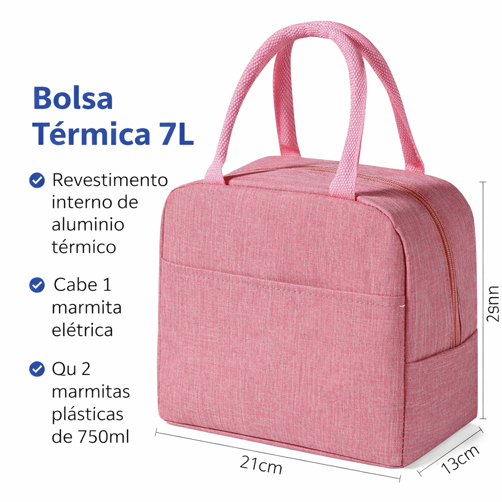 Bolsa Térmica Rosa 7L – Ideal para Marmita Elétrica Leve sua refeição com praticidade, segurança e estilo! A Bolsa Térmica 7L é perfeita para quem precisa transportar marmita no dia a dia, mantendo os alimentos quentes ou frios por mais tempo. Fabricada em tecido resistente, conta com revestimento interno em alumínio térmico, que ajuda a conservar a temperatura dos alimentos e facilita a limpeza. Seu tamanho é ideal para o uso diário, seja no trabalho, escola, academia ou viagens curtas. Principais Características Capacidade de 7 Litros Cabe 1 marmita elétrica ou 2 marmitas plásticas de 750ml Revestimento interno em alumínio térmico Mantém alimentos quentes ou frios por horas Não vaza e é fácil de limpar Design moderno e discreto na cor rosa Alça de mão resistente para transporte confortável Especificações Técnicas : Material externo: Tecido Revestimento interno: Alumínio térmico Capacidade: 7L Dimensões: Altura: 21 cm Comprimento: 23 cm Profundidade: 13 cm Cor: Rosa Fechamento: Zíper Ideal para : Trabalho e escritório Motoristas de aplicativo Escola e faculdade Academia Viagens curtas Observação: Imagem ilustrativa. As cores podem variar levemente conforme a tela do dispositivo.
