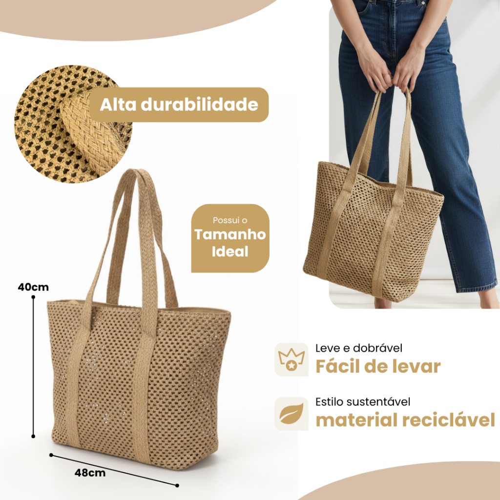 Se você procura uma bolsa bonita, neutra e muito espaçosa, vai se encantar com a bolsa reciclável trançada. Ela tem aquele visual de praia sofisticada, mas funciona perfeitamente para trabalho, mercado e passeios, acompanhando você em todas as ocasiões. Quem nunca saiu de casa com mil coisas na mão, trocando de sacola, bolsa pequena e mochila, sem achar nada dentro? A bolsa resolve isso em um só produto: grande por dentro, leve por fora, com zíper no topo e bolso interno para deixar documentos, celular e chaves bem guardados. Assim você carrega tudo o que precisa com segurança e ainda mantém o look organizado. Ela é feita em material reciclável trançado, com textura que lembra palha, trazendo um toque natural e moderno ao mesmo tempo. O tamanho aproximado de 48 cm de largura por 40 cm de altura oferece espaço de sobra para carteira, necessaire, canga ou toalha, garrafa de água, casaco leve e o que mais você usa no dia a dia. As alças longas e resistentes permitem usar no ombro com conforto, mesmo quando a bolsa está cheia. O fechamento em zíper e o bolso interno deixam suas coisas mais protegidas, ideal para usar em transporte público, viagens e passeios movimentados. Você ainda conta com a tranquilidade da nossa garantia de 30 dias contra defeitos de fabricação. Comprou, usou e apareceu algum problema de fabricação? É só falar com a Bogu Store que a nossa equipe te ajuda. Se você quer uma bolsa versátil, que funciona na praia, na cidade e nas compras, a bolsa reciclável trançada é a escolha certa. Aproveite enquanto temos estoque e garanta a sua agora mesmo. Agradecemos a sua visita à nossa loja. Características do produto: • Bolsa grande, reciclável, com acabamento trançado • Visual neutro, combina com vários estilos de roupa • Ideal para praia, trabalho, mercado e passeios Características técnicas do produto: • Material: fibra sintética reciclável trançada • Forro interno em tecido liso • Fechamento principal em zíper • Bolso interno com zíper • Dimensões aproximadas: 48 cm de largura x 40 cm de altura • Alças duplas longas para uso no ombro • Cores: tons de bege naturais, podendo variar levemente conforme o lote e a tela O que o cliente vai receber: • 1 bolsa reciclável trançada com zíper e bolso interno
