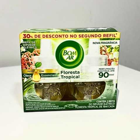 Este anúncio contém uma variação de Bom Ar difusor elétrico Floresta Tropical Aparelho + Refil ou somente o Refil com 2 unidades (pra quem já possui o aparelho). Esta é a mais nova fragrância lançada pela marca! Experimente esta fragrância no seu lar, ambiente de trabalho e sinta o ambiente cheiroso e aconchegante. Funciona nas tenções 127/220 volts. Floresta Tropical faz parte de uma linha inspirada na riqueza natural dos biomas brasileiros e traduz, de forma olfativa, a diversidade das paisagens do país. A fragrância apresenta um acorde aquoso e refrescante, que remete à sensação de avistar rios e espelhos d’água em meio à floresta, combinado a facetas de folhagens verdes e notas cítricas, como casca de laranja, limão e grapefruit. Em seu corpo, revela a delicadeza das flores, finalizada por um fundo amadeirado de cedro, com um toque cremoso de baunilha que adicionam conforto à composição. A proposta é evocar diferentes expressões da natureza brasileira e valorizar a pluralidade da flora nacional por meio de uma composição contemporânea, natural e envolvente. Principais Benefícios Perfume contínuo por até 45 dias. Fragrância Floresta Tropical – aroma relaxante e aconchegante. Difusor elétrico prático – é só conectar na tomada. Feito com óleos essenciais, Ideal para quartos, salas, banheiros e escritórios. Modo de Uso 1. Rosqueie o refil no aparelho. 2. Conecte na tomada (posição vertical). 3. Ajuste a intensidade conforme desejar. 4. Pronto! Ambiente perfumado 24h por dia.