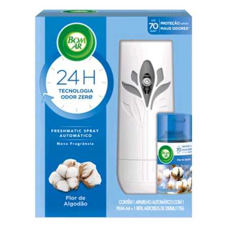 Transforme o clima da sua casa com a praticidade do Bom Ar Freshmatic! O kit completo (Aparelho + Refil) foi desenvolvido para manter seus ambientes sempre perfumados de forma automática e sem esforço. Com tecnologia que elimina maus odores de banheiro, cozinha e pets, ele garante uma sensação de frescor constante. POR QUE ESCOLHER O BOM AR AUTOMÁTICO? Perfumação Contínua: Esqueça a necessidade de borrifar manualmente. O aparelho faz tudo por você! Longa Duração: O refil de 250ml dura até 70 dias (na intensidade mínima). Controle de Intensidade: Possui 3 níveis de ajuste para você escolher a frequência das borrifadas (a cada 9, 18 ou 36 minutos). Design Moderno: Discreto e elegante, combina com qualquer decoração, seja na sala, quarto ou escritório. Tecnologia Odor Zero: Bloqueia e neutraliza odores desagradáveis em vez de apenas mascará-los. O QUE VEM? 01 Aparelho Difusor Automático Bom Ar. 01 Refil de 250ml (Fragrância conforme escolha no ato da compra). 01 pilha Alcalina AA COMO USAR (PASSO A PASSO): Abra o aparelho pressionando o botão no topo ou girando a base (conforme o modelo). Certifique-se de que o interruptor de intensidade está na posição "OFF". Insira o refil com o bico voltado para fora. Insira a pilha AA seguindo a polaridade correta. Feche o aparelho, escolha a intensidade desejada e posicione-o em um local alto (pelo menos 2 metros do chão). ATENÇÃO: O primeiro spray ocorre após 15 segundos da ativação. ESPECIFICAÇÕES TÉCNICAS: Marca: Bom Ar (Air Wick) Volume do Refil: 250ml / 175g Compatibilidade: Aceita refis Bom Ar.