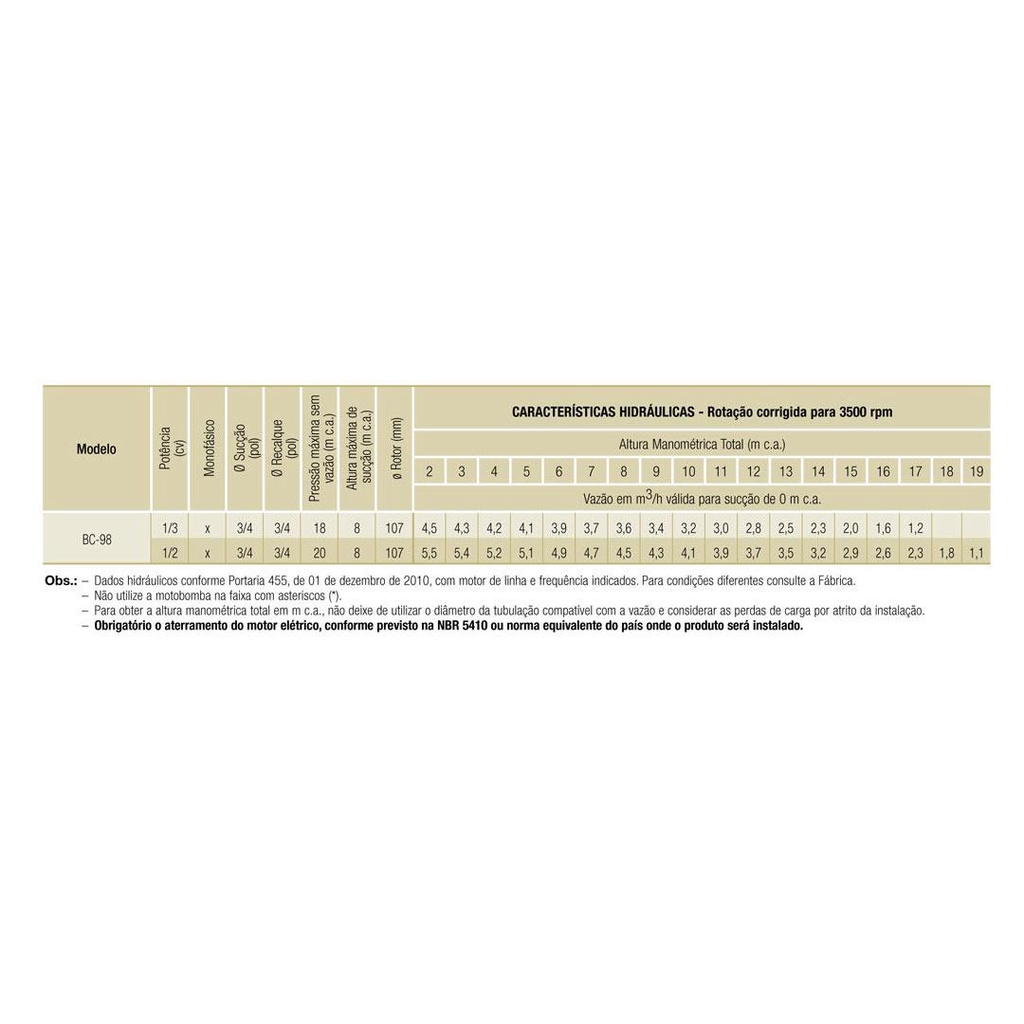 Bomba de Água Centrífuga 0,33 CV 1/3 POL Mono BC-98 SCHNEIDER APLICAÇÕES:Aplicações Gerais.Residências.Fontes e cascatas.Chácaras.Detalhes Técnicos do Produto. DADOS TÉCNICOS:Bocais com rosca BSP.Caracol da motobomba de ferro fundido GG-20.Rotor fechado de Noryl®, com 30% de fibra de vidro (maior resistência).Selo mecânico constituído de aço inox AISI-304, buna N, grafite e cerâmica.Motor elétrico IP-21 com flange incorporada, termostato e capacitor permanente, 2 Polos, 60 Hz.Voltagem: 127 V ou 220 V (não é bivolt). Importante:Temperatura máxima do líquido bombeado: 55°C.Equipamento desenvolvido para uso exclusivamente residencial. * Imagens meramente ilustrativas.