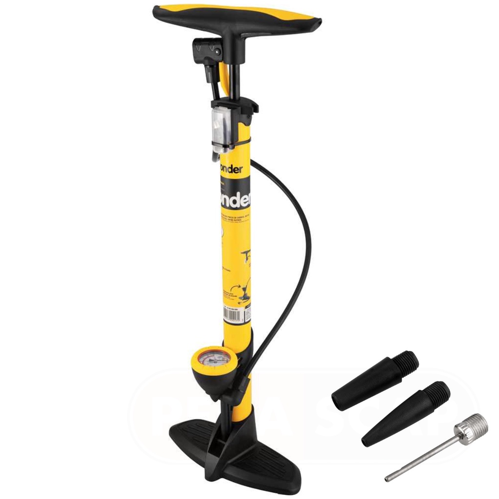 Bomba De Ar Manual Para Encher Pneus Carro Moto Bike 63cm - Vonder Possui corpo metálico e plataforma de apoio em plástico reforçado, manômetro para indicação da pressão com ajuste e mangueira plástica com 70 cm. Conta ainda com compartimento específico para armazenamento dos bicos. Indicada para encher pneus de carros, motos, bicicletas, entre outros. Nunca solte o cabo tipo "T" enquanto o mesmo estiver pressionado e pressurizado risco de acidente. Informações Técnicas: - Material do corpo da bomba: Aço carbono - Altura da bomba: 63 cm - Cor do corpo da bomba: Preta e amarela - Diâmetro do corpo da bomba: 1.1/2" - 38 mm - Material do cabo da bomba: Plástico - Comprimento da mangueira da bomba: 70,0 cm - Pressão máxima da bomba: 118 lbf/pol² - Massa aproximada (peso): 0,8 kg Conteúdo da Embalagem: - 1 Bomba de ar - 1 Agulha para encher bolas - 2 Bicos para encher infláveis diversos Garantia: - Garantia legal: 90 dias OBSERVAÇÕES: * Imagens com proteção autoral. O uso indevido estará sujeito a LEI Nº 9.610. (Não copie, evite transtornos).*