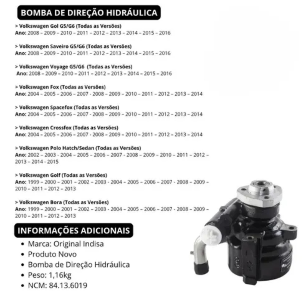 Bomba Direção Hidráulica Para VW Specefox Fox Gol G5 G6 Saveiro G5 1.0 1.6 2009 Em Diante Original Indisa