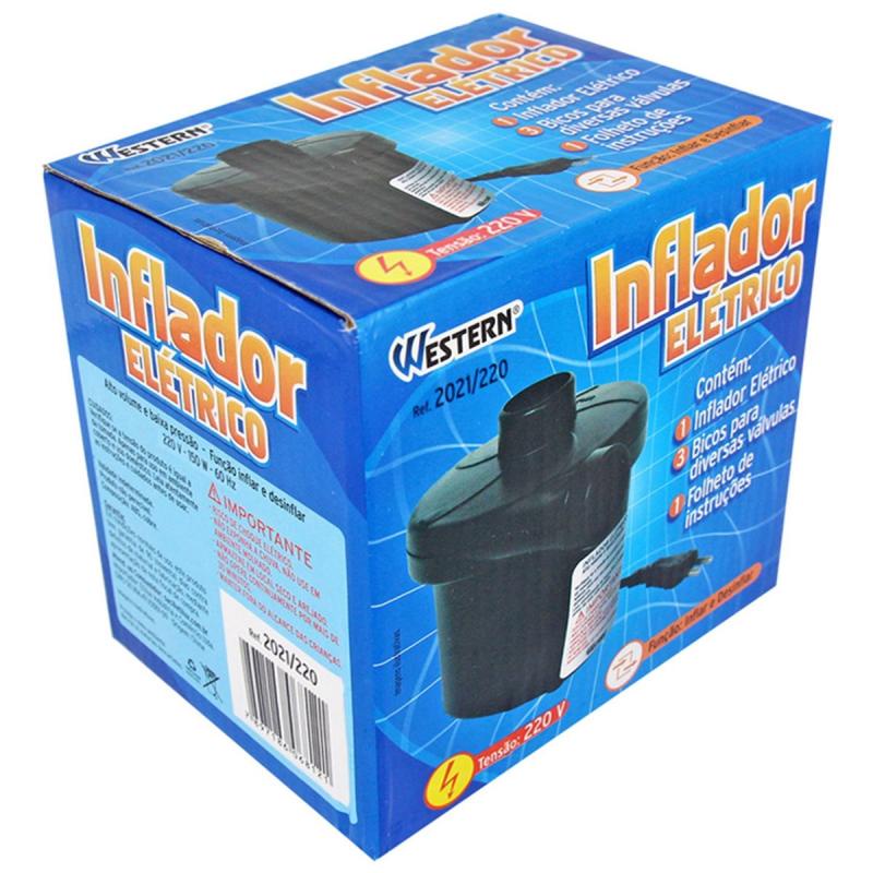 Bomba Elétrica Inflador para Colchão, Bóia, Piscinas e Inflável WESTERNInflar e DesinflarIdeal para: Colchões, Boias, Piscina / e outros infláveis.Material: Abs / CobreTipo: ElétricoVoltagem: 127V ou 220V (não é bivolt)Potência: 150wFrequência: 60hzMarca: WesternConteúdo da Embalagem:1 Inflador elétrico3 Bicos para diversas Válvulas1 Folheto instruçõesDimensões aproximadas da embalagem : 10 x 15 x 13 cmPeso aproximado da embalagem: 0,5 KgGarantia: 3 MesesCódigos de Fábrica: 2021/127 - 2021/220*Imagem meramente ilustrativa.