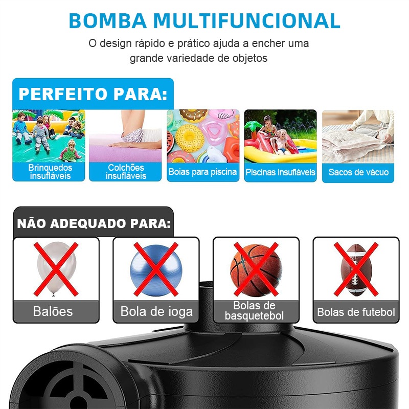 *Bomba de Inflar e Esvaziar Elétrica Bivolt 220V - Eficiência e Versatilidade para Infláveis *Descrição do Produto: *Versátil e Prático: Ideal para inflar e desinflar rapidamente boias, botes, colchões e outros infláveis de grande volume. *Alto Fluxo de Ar: Potente desempenho com função de inflar e esvaziar, otimizando o tempo e o esforço. *Bicos Adaptáveis: Inclui 3 bicos intercambiáveis para se adequar a diferentes tipos de válvulas. *Conteúdo do Pacote: *1 Inflador Elétrico Bivolt (220v, 30 W). *3 Bicos para Diversas Válvulas. *1 Folheto de Instruções. *Especificações Técnicas: *Tipo de Produto: Bomba de inflar e esvaziar elétrica. *Material: ABS e Cobre. *Cor: Preto. *Potência: 30 W. *Segurança e Cuidados: *Risco de Choque Elétrico: Não exponha à chuva e evite usar em ambientes molhados. *Armazenamento: Guarde em local seco e ventilado. *Manuseio Seguro: Leia o manual antes de usar e mantenha fora do alcance das crianças. *Ideal para Usos Diversos: Ideal para inflar colchões, boias, piscinas e até para acender churrasqueiras, entre outros usos. Adquira agora sua Bomba de Inflar e Esvaziar Elétrica e torne suas atividades de lazer ou tarefas domésticas mais práticas e rápidas!