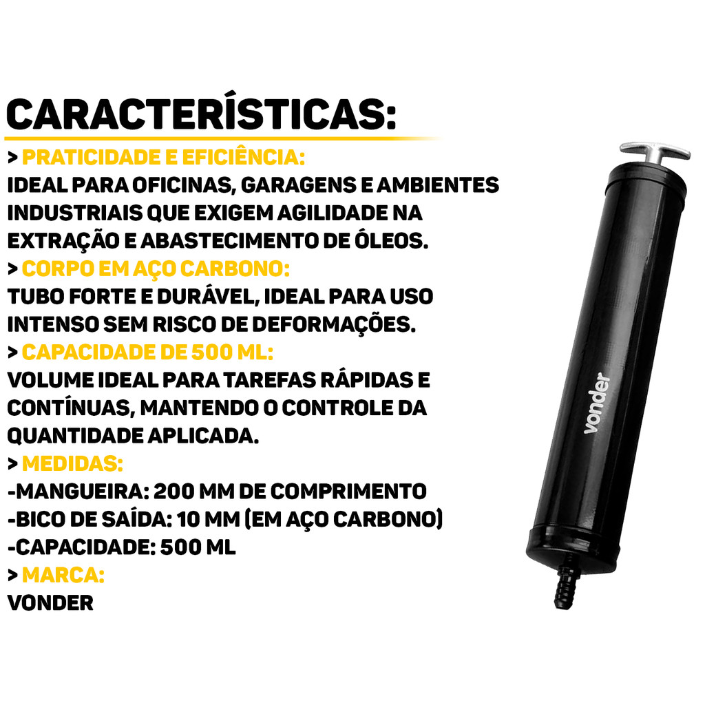 Bomba Para Transferência De Óleo 500ml Vonder A Bomba Tipo Seringa Vonder é ideal para a transferência de óleos lubrificantes e outros líquidos automotivos com facilidade e precisão. Com capacidade de 500ml, é perfeita para aplicações em locais de difícil acesso, garantindo maior controle durante o uso, evitando desperdícios. É prática, eficiente e indispensável para trabalhos em oficinas. Características: > Indicado para realizar transferências de óleo; > Capacidade de 500ml para operação simples e rápida; > Tubo em aço carbono, proporcionando maior resistência; > Bico tipo seringa, que permite um controle preciso na aplicação do óleo e facilidade de manuseio. Especificações Técnicas: > Material: aço carbono; > Diâmetro do bico de saída: 10mm; > Capacidade do reservatório: 500ml; > Comprimento total do tubo: 730mm. - Marca: Vonder - Garantia: 90 dias contra defeitos de fabricação Vantagens de comprar na Brester: - Produto a pronta entrega. - Produto novo, com garantia de fábrica. - Nota fiscal para Pessoa Física e Pessoa Jurídica.