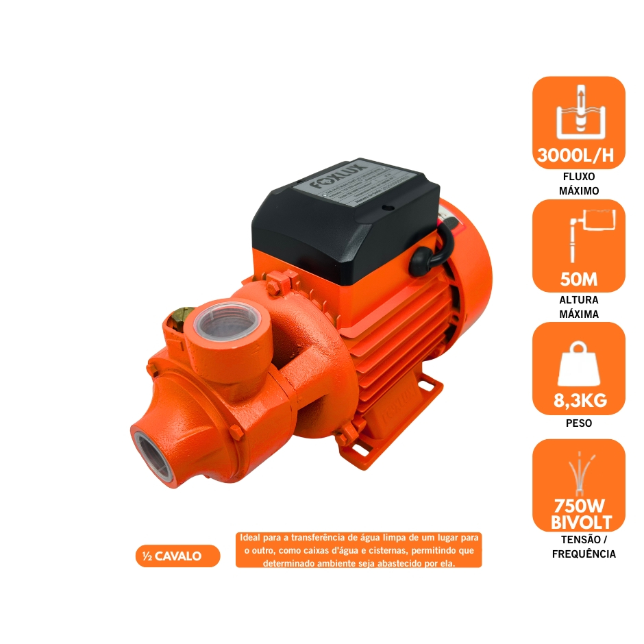 Bomba Periférica Foxlux 1/2 CV 220V Para Água Limpa com Vazão 2.400 L/h e Altura 30 mca