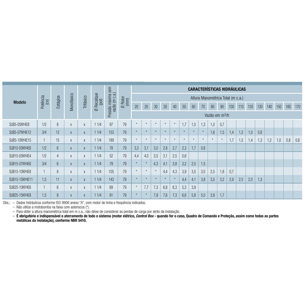 Bomba Submersa 0,5 CV (1/2) Monofásica SUB15-05NY4E4 110V SCHNEIDERDados Gerais Modelo: SUB15-05NY4E4 Monofásica Potência: 1/2 CV Voltagem: 110V Marca: Schneider Bombas centrífugas multiestágios, acopladas a motores elétricos projetados especialmente para funcionar dentro d’água, a grandes profundidades. Aplicações Gerais • Bombeamento de águas subterrâneas em poços tubulares com diâmetro interno a partir de 4”. Detalhes Técnicos do Produto Padrão • Bocal de saída 1 1/4” com rosca BSP • Eixo do bombeador de aço inox • Mancal de Viton® e corpo do mancal de Noryl® GFN3(*) • Sistema TRI-SEAL® com rotores flutuantes independentes • Rotor fechado de Celcon® • Difusor e divisão de Noryl® GFN3(*) • Corpo, bocal de saída, intermediário e filtro de aço inox • Válvula de retenção incorporada • Motor elétrico encapsulado, 2 Pólos, 60 Hz (*) Noryl® GFN3: Noryl® com 30% de fibra de vidro Importante • A motobomba submersa foi projetada para bombear água potávelcom temperatura máxima de 30°C. Consulte a Fábrica para qualquer situação de bombeamento diferente.