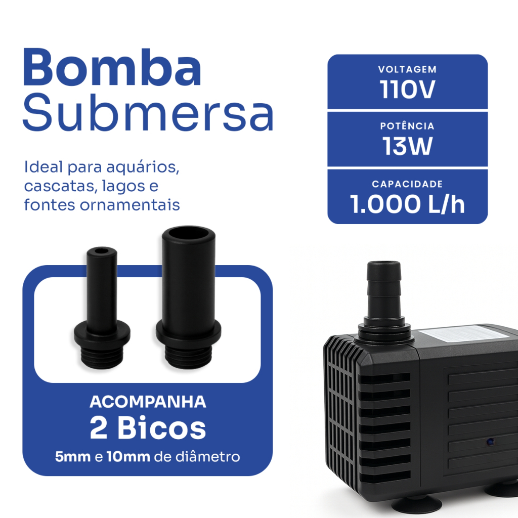 *Bomba Submersa 110V* A Linha de Bombas Submersas da Variall é a opção ideal para garantir a circulação e oxigenação adequadas em aquários, fontes, chafarizes e lagos ornamentais. Com uma vazão de 1.000L/h, oferece bom desempenho e baixo consumo de energia, sendo perfeita para uso contínuo. Também possui quatro ventosas poderosas, muito adequadas para instalação em superfícies de vidro. Pode ser desmontada sem ferramentas e é fácil de usar. Dentre os diversos usos, podemos citar: aquário de peixes, fontes, lagos ornamentais, dispositivo de circulação de água em lagoa de jardim e sistemas hidropônicos. E é adequada tanto para aplicações de água doce quanto em água salgada. Características Principais: - Indicada para aquários, lagos e terrários, além de fontes ornamentais e chafarizes. - Design compacto e moderno, com proteção térmica para maior segurança. - Silenciosa e eficiente, proporcionando um ambiente tranquilo para seus peixes e plantas aquáticas. - Regulagem de vazão para ajustar conforme a necessidade. - Disponível na voltagem de 110V Especificações Técnicas: - Frequência: 60Hz - Potência: 13W - Vazão Máxima: 1.000 L/h - Coluna d'água Máxima: 50 Centímetros - Comprimento do Cabo: 1,8 Metros - Diâmetro dos Bicos: 05 mm e 10 mm - Temperatura de Operação: 5°C até 40°C Conteúdo da embalagem: - 01 Bomba Submersa 1.000 L/h Variall. - Kit de Ventosas para Fixação Segura. Observações Importantes: - A bomba deve permanecer totalmente submersa para um funcionamento correto. - Não ligue a bomba quando estiver em ambiente seco. - Silenciosa e eficiente, ideal para uso contínuo.