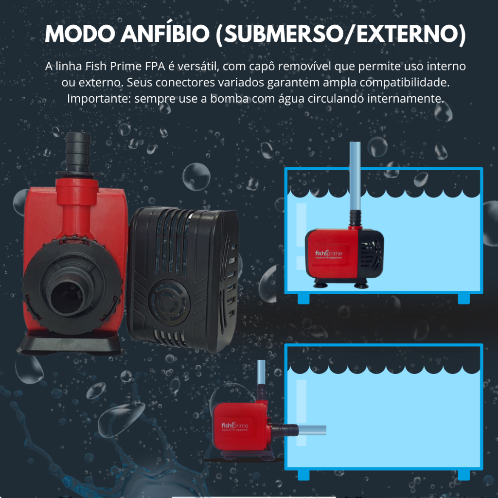 Seja Bem-Vindo à AQUALOVE !!! *** Revenda Oficial Fish Prime no Brasil !!! ================================ BOMBA SUBMERSA FISH PRIME FPA 4000 Litros/Hora ou FPA 5000 Litros/Hora. (Selecionar no anúncio). ================================ *** MELHOR CUSTO BENEFÍCIO em Bomba de Circulação/Recalque *** *** ANFÍBIA / SUBMERSA (Função Descrita na Terceira Imagem) *** *** Eixo do Impeller em CERÂMICA *** *** Alto DESEMPENHO e DURABILIDADE *** *** BAIXO CONSUMO para sua categoria *** ================================ CARACTERÍSTICAS TÉCNICAS FPA 4000 L/H: Motor: 100% em Cobre Conexões de Saída: 14/17/25 mm Vazão Máxima: 4000 litros/hora. Cabo normatizado Inmetro: 1,14 metros. Potência: 50 Watts. Consumo: 0,05 kWh. Para saber o consumo mensal, considerando que ela fique ligada 24h por dia, basta multiplicar 0,05 x 720 x valor do kWh da sua região. Dimensões: 14 x 11 x 6 cm Voltagem: Selecionar no anúncio. Caso não tenha a voltagem desejada, é porque estamos sem estoque no momento. Coluna máxima para construção de fontes (coluna de água): 270 cm / 2,7 m Ultra silenciosa, econômica e durável. ================================ CARACTERÍSTICAS TÉCNICAS FPA 5000 L/H: Motor: 100% em Cobre Conexões de Saída: 17 - 25 mm Vazão Máxima: 5000 litros/hora. Cabo normatizado Inmetro: 1,14 metros. Potência: 75 Watts. Consumo: 0,05 kWh. Para saber o consumo mensal, considerando que ela fique ligada 24h por dia, basta multiplicar 0,05 x 720 x valor do kWh da sua região. Dimensões: 17 x 11 x 7 cm Voltagem: Selecionar no anúncio. Caso não tenha a voltagem desejada, é porque estamos sem estoque no momento. Coluna máxima para construção de fontes (coluna de água): 350 cm / 3,5 metros. Ultra silenciosa, econômica e durável. ================================ COMO DIMENSIONAR A BOMBA IDEAL PARA O SEU SISTEMA: - AQUÁRIO: Recomenda-se uma vazão de 10 à 15 vezes o volume (litros) do seu aquário. Exemplo: Se o seu aquário tem 200 litros, recomenda-se uma bomba de 2000 à 3000 litros/hora. - LAGO: Recomenda-se uma vazão mínima de 4 vezes o volume (litros) do seu lago. Exemplo: Se o seu lago tem 1000 litros, recomenda-se uma bomba de no mínimo 4000 litros/hora. *** Quanto maior a vazão, melhor a filtragem, circulação, oxigenação da água e consequentemente melhor a qualidade da água. ================================ CUIDADOS: 1- Não levante a bomba pelo cabo. 2- Desligue a bomba antes de manuseá-la. 3- Usar somente em água limpa. 4- Não usar em líquidos quentes (acima de 50 graus). 5- Usar totalmente submersa ou abaixo do nível da água (anfíbia). 6- Limpar periodicamente o rotor/impeller (a manutenção da bomba é essencial para garantir seu bom desempenho e prolongar sua vida útil). ================================ SOBRE NÓS: Aqualove - Loja OFICIAL Fish Prime 1- NOTA FISCAL e PRONTA ENTREGA em todos os produtos (Compra SEGURA e com GARANTIA). 2- Inspecionamos e Embalamos com Carinho a sua Compra. 3- ENVIO RÁPIDO (até 24h úteis). 4- Nosso COMPROMISSO é com a sua SATISFAÇÃO. ================================