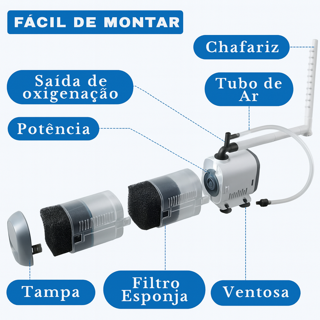 🐠 LINHA JP AQUATANK JP-300: VAZÃO 300 L/H --- Potência 5W --- Coluna d'água 80cm - Para aquarios até 30 Litros JP-500: VAZÃO 500 L/H --- Potência 8W --- Coluna d'água 1,0 Metro - Para aquarios até 50 Litros JP-800: VAZÃO 800 L/H --- Potência 12W --- Coluna d'água 1,2 Metro - Para aquarios até 80 Litros JP-1200: VAZÃO 1200 L/H --- Potência 20W --- Coluna d'água 1,4 Metro - Para aquarios até 120 Litros JP-1800: VAZÃO 1800 L/H --- Potência 30w --- coluna d'água 1,6 Metro - Para aquários até 180 Litros Com uma vazão poderosa esse filtro é altamente eficiente na remoção de pequenas partículas e impurezas, garantindo a pureza e a saúde da água do seu aquário. Seja para aquários de água doce ou salgada, o Filtro Submerso Aquantank é a opção versátil que você precisa. Dicas valiosas para um desempenho ideal: efetue trocas parciais de água regularmente, alimente suas espécies de peixe adequadamente, lave o refil semanalmente e nunca utilize água com cloro para limpar o refil, preservando assim a biologia essencial para um ambiente saudável. Cuide dos seus peixinhos com a mais alta qualidade em filtragem! Adquira agora mesmo o Filtro Submerso Aquatank e proporcione aos seus peixes um ambiente sempre limpo e saudável. Surpreenda-se com a beleza e o brilho dos seus peixinhos em um aquário impecável com a eficiência da nossa filtragem submersa!