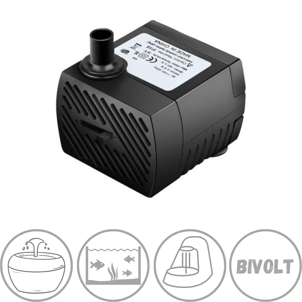 | BOMBA SUBMERSA P/ BEBEDOURO PET FONTES HIDROPONIA AQUARIOS 200L/H A... este produto | R$ 19,40 | — | 4.9/5 | — |