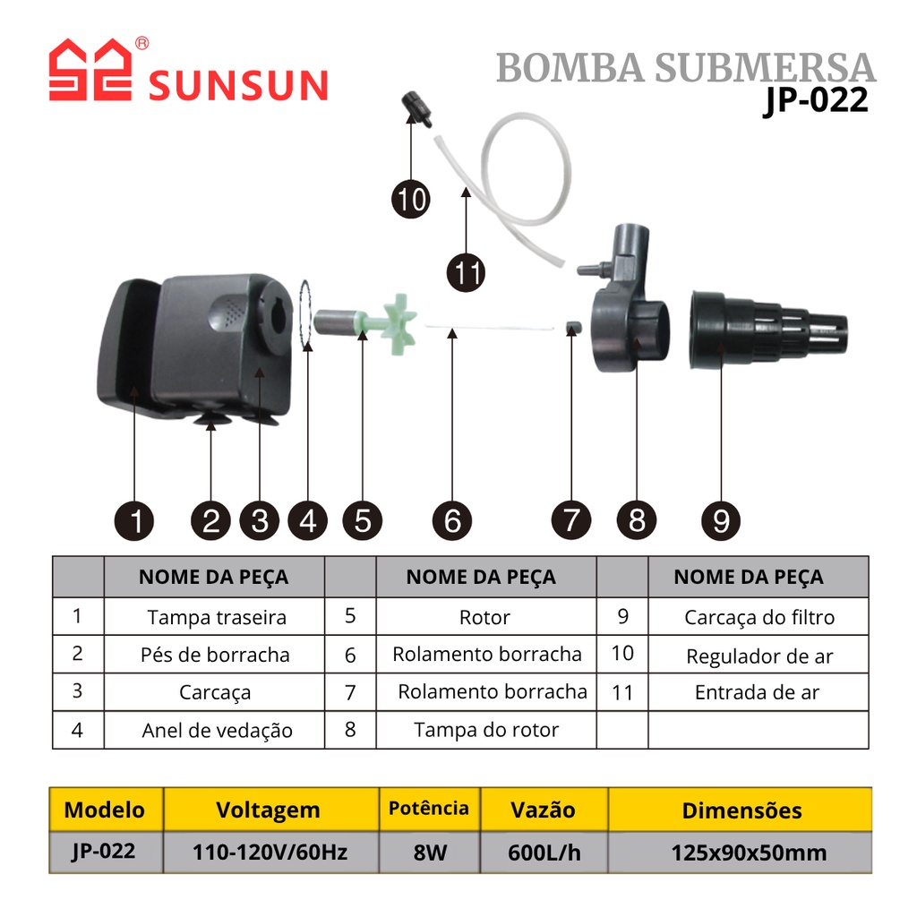 Bomba submersa SunSun JP-022 110V duas saidas 600l/h lago aquario tranque fonte + brinde Anticloro