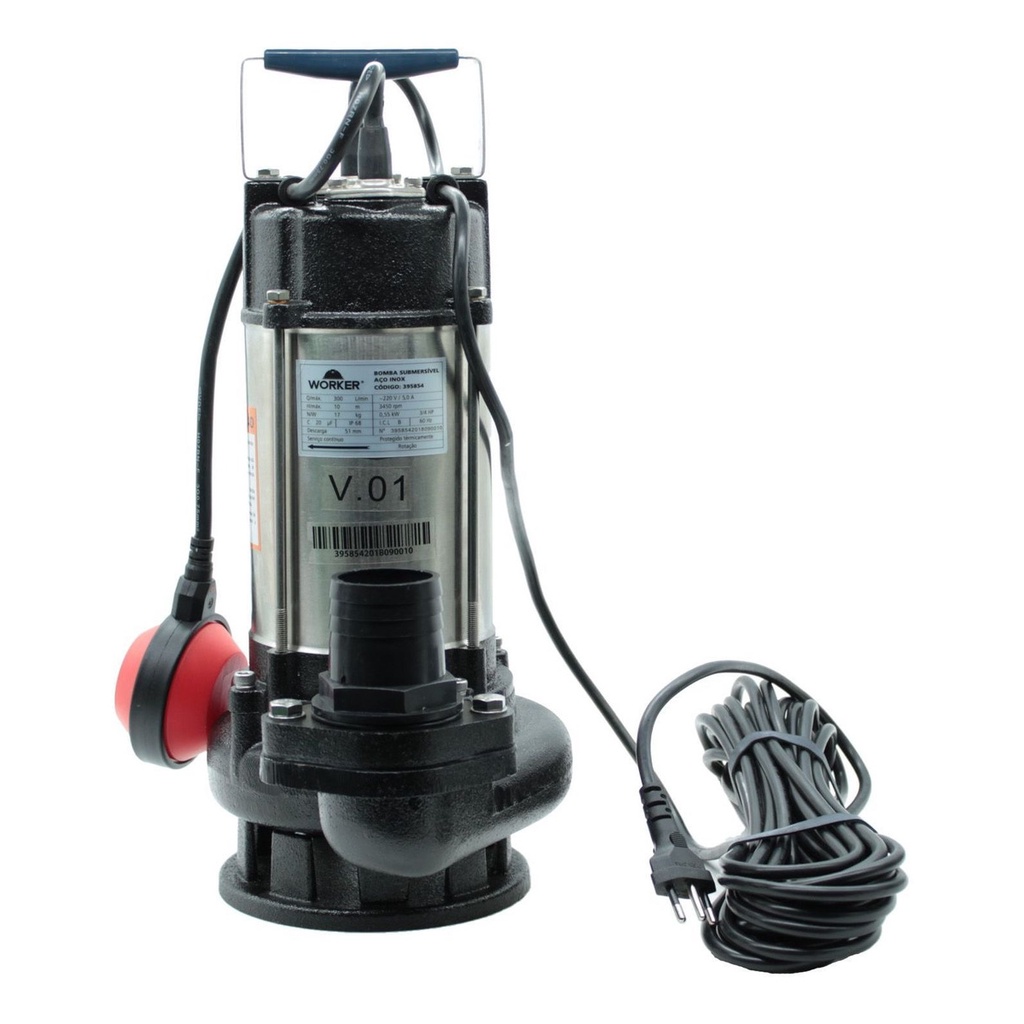 Bomba Submersível em Aço Inox ( Para Esgoto) com Boia Motor 2 Polos Worker Bomba indicada para drenagem de água servidas e pluviais, limpeza de caixa de água, bombeamento de efluentes não fibrosos, industriais. - Suporte do Motor em aço inox. - Suporte do Rotor em ferro fundido. - Proteção contra surto de tensão. - Proteção contra falta de fase e sobrecarga. - Acompanha Boia de Nível. Referencia: 50006 - Código: 395870 - Modelo: Bomba Submersa - Marca: Worker - Potência em kW: 0,75 kW - Potência: 1Hp - Voltagem: 127v ou 220v (Escolher conforme disponibilidade). - Frequência: 60hz - Rotações: 3.450rpm - Filtro de Abrasivos: Até 2mm - Temperatura da Água: 40°c - Recalque (Saída): 2 Polegadas - Altura Máxima: 12 Metros - Vazão Aproximada: 390 Litros / Minuto - Classe de Proteção: IP68 - Isolamento: Classe E - Embalagem: Caixa - Garantia: 6 Meses Dimensões Aproximadas: - Altura: 46cm - Largura: 15,24cm - Peso: 10kg