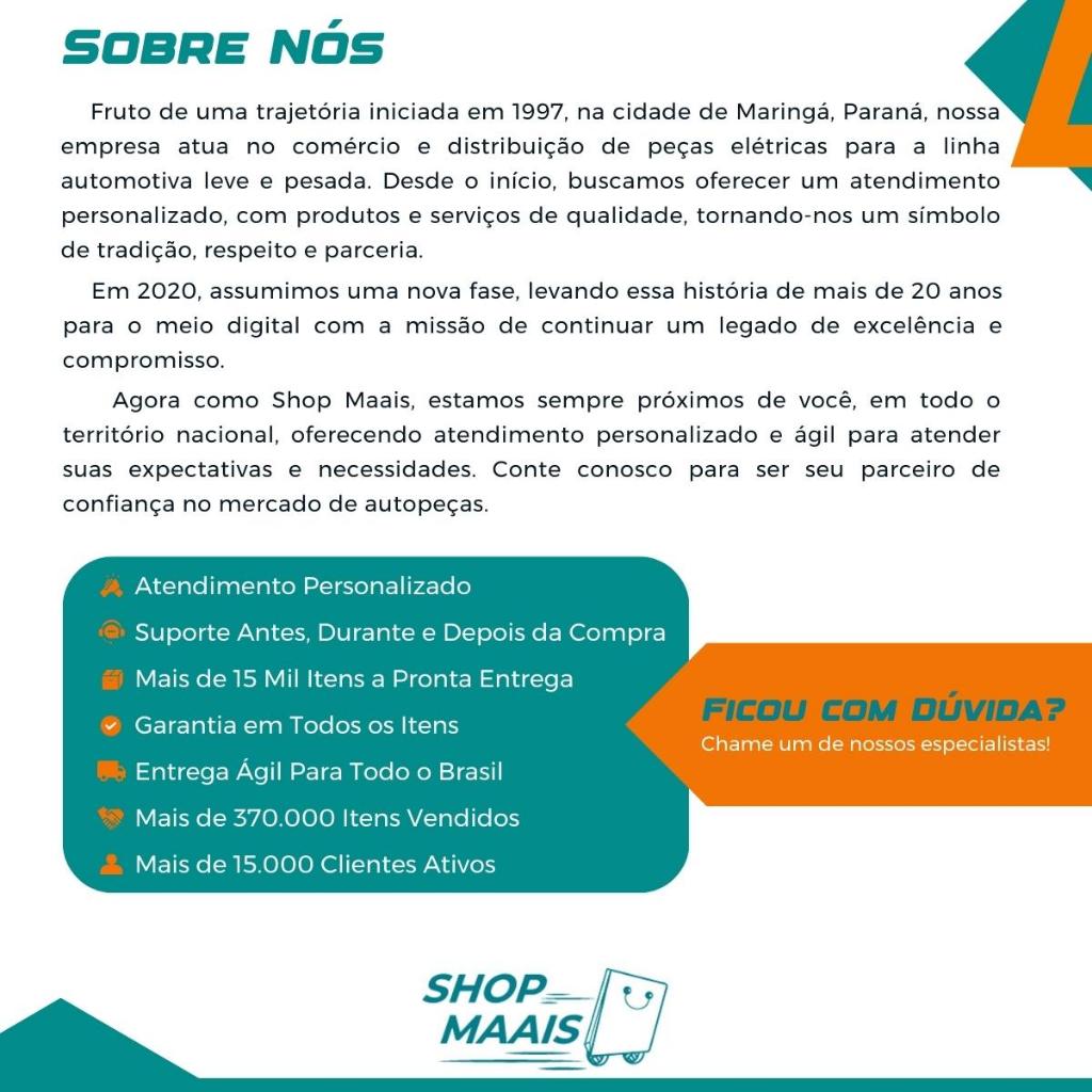 Bombinha de Água ( Esguicho para-brisa) - Bico Fino 2 saídas - 12V Especificações Técnicas: - Marca: Vetor Automotivos - Quantidade de Saídas: 2 - Voltagem: 12V - Peso bruto: 0.108 kg - Dimensões aproximadas da embalagem - (AxLxC): 0.06 x 0.06 x 0.11 m APLICAÇÕES: Chevrolet - Astra (12V - 2 saídas C/Conector) - 1995, 1996, 1997, 1998, 1999, 2000, 2001, 2002, 2003, 2004, 2005, 2006, 2007, 2008, 2009, 2010, 2011 Volkswagen - Gol (12V - 2 saídas C/Conector) - 1981, 1982, 1983, 1984, 1985, 1986, 1987, 1988, 1989, 1990, 1991, 1992, 1993, 1994, 1995, 1996, 1997, 1998, 1999, 2000, 2001, 2002, 2003, 2004, 2005, 2006, 2007, 2008, 2009, 2010, 2011, 2012, 2013, 2014, 2015, 2016, 2017, 2018, 2019, 2020, 2021, 2022, 2023, 2024, 2025 - Parati (12V - 2 saídas C/Conector) - 1985, 1986, 1987, 1988, 1989, 1990, 1991, 1992, 1993, 1994, 1995, 1996, 1997, 1998, 1999, 2000, 2001, 2002, 2003, 2004, 2005, 2006, 2007, 2008, 2009, 2010, 2011, 2012, 2013 CÓDIGOS EQUIVALENTES: - Volkswagen - 377955651A - DNA - DNA012BFC2S - DRIFT - DK807.31 - DS - 31006 - GAP - AA0006-80761 - MARÍLIA - 20611 - TSA - 807005A - VP - 7042 SOBRE NÓS - SHOP MAAIS Com mais de 27 anos de experiência no mercado, a Shop Maais se destaca pela tradição e confiança em cada peça automotiva que oferecemos. Garantimos produtos de alta qualidade e entrega rápida, sempre com o foco em um atendimento personalizado para atender às necessidades de nossos clientes. Caso tenha dúvidas, entre em contato com nosso time de especialistas. Estamos prontos para ajudar! Shop Maais – Tradição e confiança em cada peça!