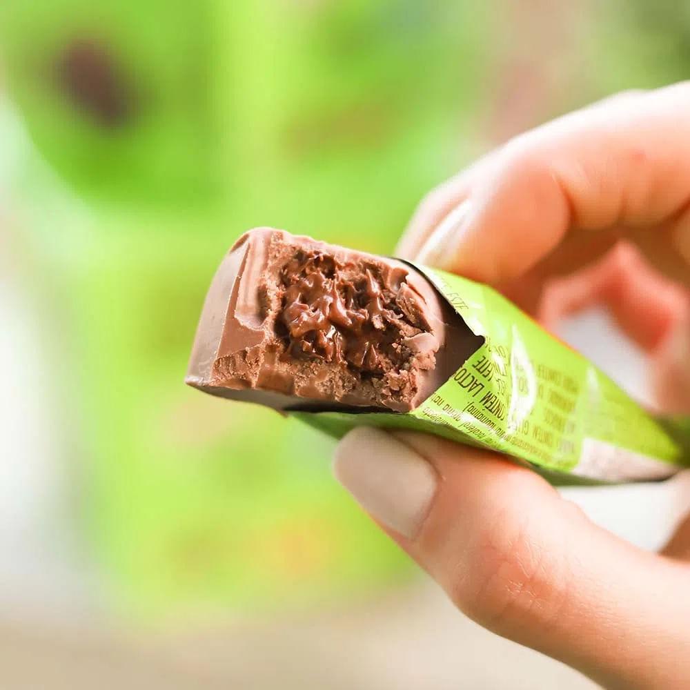 Bombom de chocolate ao leite com recheio de creme de avelã crocante. Zero adição de açúcares, sem glúten, sem adoçantes artificiais e delicioso! Perfeito como sobremesa ou para quando bater aquela vontade de comer um chocolate. Display com 18 unidades de 12g.