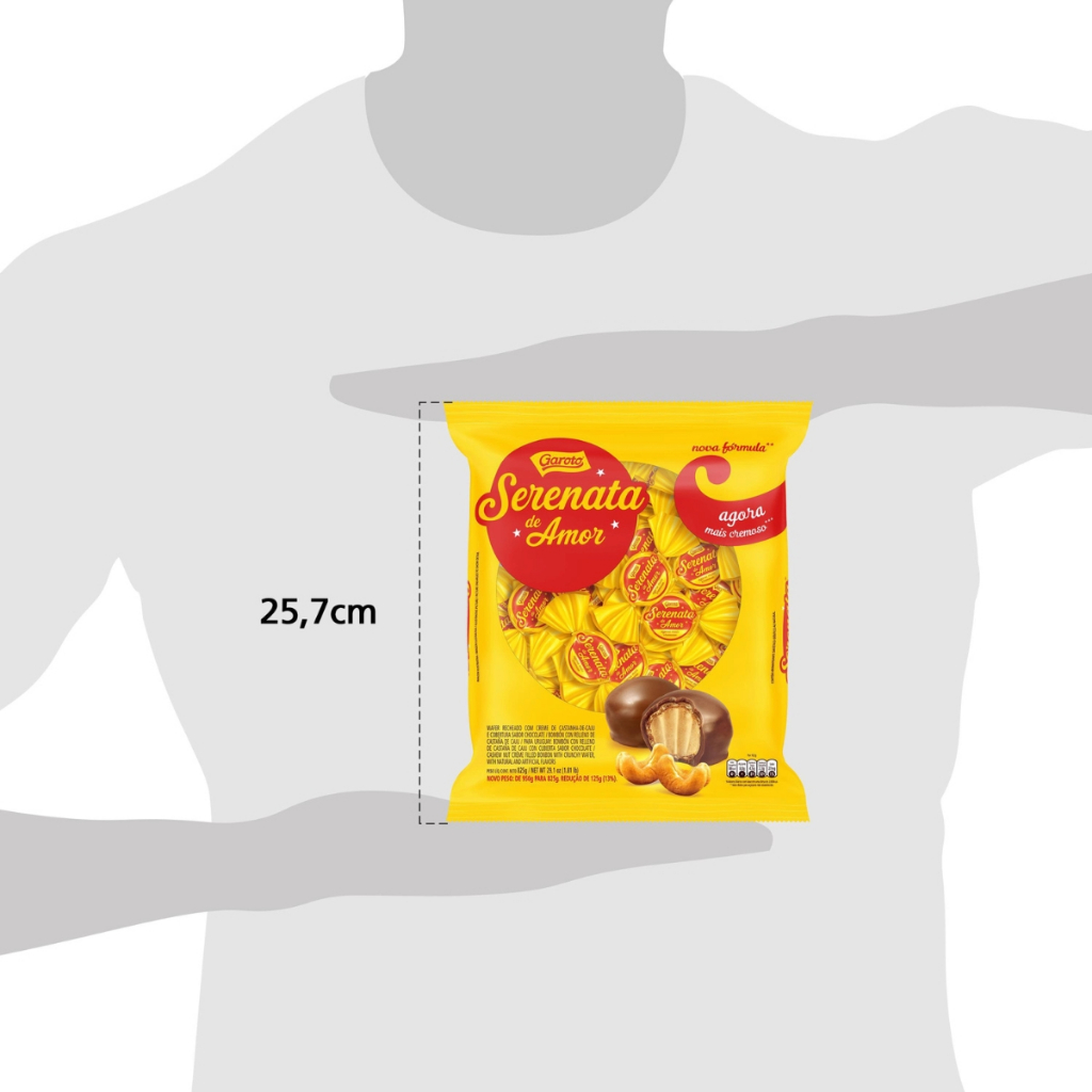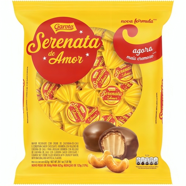 A combinação perfeita da crocância do wafer, da cremosidade do recheio de castanha-de-caju e da camada de chocolate ao leite. Serenata de Amor oferece um momento de prazer, uma parada para melhorar o seu dia. É um gesto de carinho que faz você se sentir especial. Ingredientes: Açúcar, gordura vegetal, farinha de trigo enriquecida com ferro, ácido fólico, tiamina, riboflavina, niacina e zinco, leite em pó, massa de cacau, cacau em pó, castanha-de-caju, gordura anidra de leite, amido, sal, xarope de glicose, óleo vegetal de soja, farinha de centeio, farinha de aveia, emulsificantes lecitina de soja e poli glicerol polirricinoleato, aromatizantes e fermento químico bicarbonato de sódio. ALÉRGICOS: CONTÉM CASTANHA-DE-CAJU E DERIVADOS DE LEITE, DE SOJA, DE AVEIA, DE CENTEIO E DE TRIGO. PODE CONTER AMENDOIM, AMÊNDOA, CASTANHA-DO-PARÁ, AVELÃ, NOZES E CEVADA. CONTÉM LACTOSE. CONTÉM GLÚTEN. Contém aromatizante sintético idêntico ao natural. Contém: Aproximadamente 50 Unidades. Peso Unitário: 16,5g Somos uma loja especializada em artigos de festa, confeitaria, embalagens e atacado em doces com lojas físicas no estado de São Paulo, desde 2002. Imagens meramente ilustrativas, de acordo com nossos fornecedores que nos fornecem. Todas as Informações divulgadas são de responsabilidade do fabricante/fornecedor.