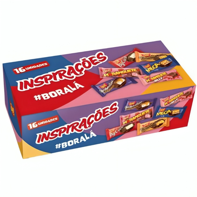 A embalagem de Bombons Bel Inspirações de 210g contém 16 unidades de bombons, trazendo uma variedade de sabores inspirados em sobremesas clássicas e combinações de sabores! A caixinha reúne os 5 novos sabores de barrinhas Bel: By Coco, Caramelo com Amendoim, Marshmallow com Caramelo, Mega e Moranguete Jelly, todos com 15g e aquele clássico que não poderia ficar de fora, o Moranguete com 9g. Estes bombons são ideais para compartilhar, presentear ou simplesmente para uma indulgência doce no dia a dia. Cada bombom é equilibrando o recheio e a cobertura para uma experiência de sabor bem agradável. Moranguete: Açúcar, xarope de glicose, gordura vegetal, cacau em pó, leite integral em pó, albumina, soro de leite em pó, ácido cítrico, ácido ascórbico, sal, umectante INS-420 (Sorbitol), emulsificantes INS-322 (Lecitina de Soja) e INS-476 (Polirricinoleato de Poliglicerol), aromatizantes e corante Allura (E-129). BAIXO TEOR EM LACTOSE. CONTÉM GLÚTEN. ALÉRGICOS: CONTÉM DERIVADOS DE LEITE, OVO E SOJA. PODE CONTER LÁTEX, TRIGO E AMENDOIM. Bel Caramelo com Amendoim: Amendoim, açúcar, gordura vegetal, xarope de glicose, leite integral em pó, cacau em pó, soro de leite em pó, sal, umectante INS-420 (Sorbitol), emulsificantes INS-322 (Lecitina de Soja) e INS-476 (Polirricinoleato de Poliglicerol) e aromatizantes. CONTÉM LACTOSE. CONTÉM GLÚTEN. ALÉRGICOS: CONTÉM AMENDOIM E DERIVADOS DE LEITE E SOJA. PODE CONTER LÁTEX, TRIGO E OVO. Moranguete Jelly: Açúcar, xarope de glicose, gordura vegetal, leite integral em pó, cacau em pó, soro de leite em pó, albumina, sal, ácido cítrico, ácido ascórbico, umectante INS-420 (Sorbitol), emulsificantes INS-322 (Lecitina de Soja) e INS-476 (Polirricinoleato de Poliglicerol), aromatizantes e corante Allura (E-129). CONTÉM LACTOSE. CONTÉM GLÚTEN. ALÉRGICOS: CONTÉM DERIVADOS DE LEITE, OVO E SOJA. PODE CONTER LÁTEX, TRIGO E AMENDOIM. Bel Mega: Açúcar, xarope de glicose, amendoim, gordura vegetal, leite integral em pó, cacau em pó, sal, soro de leite em pó, albumina, ácido cítrico, umectante INS-420 (Sorbitol), emulsificantes INS-322 (Lecitina de Soja) e INS-476 (Polirricinoleato de Poliglicerol), aromatizantes e corantes INS-150 (Caramelo), INS-110 (Amarelo crepúsculo) e INS-102 (Corante Tartrazina). CONTÉM LACTOSE. CONTÉM GLÚTEN. ALÉRGICOS: CONTÉM AMENDOIM E DERIVADOS DE LEITE, OVO E SOJA. PODE CONTER LÁTEX E TRIGO. Bel Marshmallow com Caramelo: Açúcar, xarope de glicose, gordura vegetal, leite integral em pó, cacau em pó, soro de leite em pó, albumina, sal, umectante INS-420 (Sorbitol), emulsificantes INS-322 (Lecitina de Soja) e INS-476 (Polirricinoleato de Poliglicerol) e aromatizantes. CONTÉM LACTOSE. CONTÉM GLÚTEN. ALÉRGICOS: CONTÉM DERIVADOS DE LEITE, OVO E SOJA. PODE CONTER LÁTEX, TRIGO E AMENDOIM. Bel By coco: Açúcar, coco ralado, xarope de glicose, gordura vegetal, açúcar invertido, cacau em pó, leite integral em pó, soro de leite em pó, albumina, sal, umectante INS-420 (Sorbitol), emulsificantes INS-322 (Lecitina de Soja) e INS-476 (Polirricinoleato de Poliglicerol) e aromatizantes. BAIXO TEOR EM LACTOSE. CONTÉM GLÚTEN. ALÉRGICOS: CONTÉM DERIVADOS DE LEITE, OVO E SOJA. PODE CONTER LÁTEX, TRIGO E AMENDOIM. Somos uma loja especializada em artigos de festa, confeitaria, embalagens e atacado em doces com lojas físicas no estado de São Paulo, desde 2002. Imagens meramente ilustrativas, de acordo com nossos fornecedores que nos fornecem. Todas as Informações divulgadas são de responsabilidade do fabricante/fornecedor.