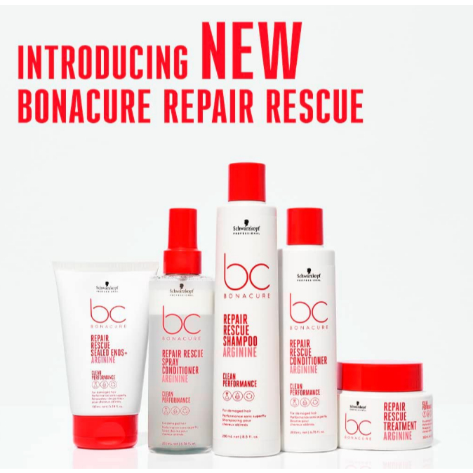 A linha Bonacure Repair Rescue, para cabelos danificados, possui Arginina como principal ativo, que reverte instantaneamente 3 anos de danos em apenas uma aplicação.