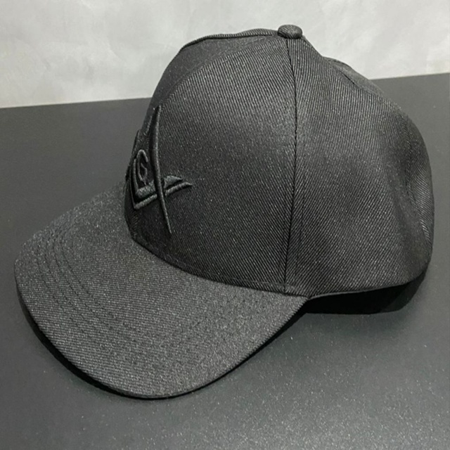 Boné em tecido, com regulagem, modelo 06 gomos, bordado com símbolos maçônicos, esquadro e compasso, bordado na cor preta na frente e no verso. Tamanho Único.