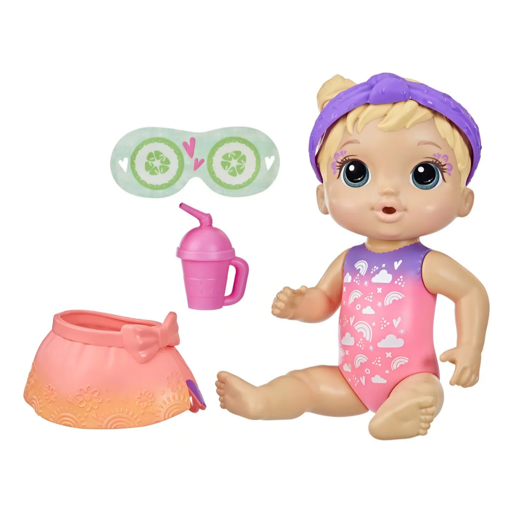É um dia de spa de faz de conta para a boneca Baby Alive! Esta boneca Baby Alive de 22,5 cm vem com uma linda máscara para olhos de boneca inspirada em pepinos. É um brinquedo divertido com tema de spa para meninas e meninos, com uma saia dupla face vibrante que as crianças podem virar e criar uma aparência diferente. A boneca Rainbow Spa Baby para crianças de 3 anos ou mais também inclui uma faixa de cabeça combinando e uma garrafinha para que as crianças possam fingir que a alimentam. Com 5 pontos de articulação, esta boneca é um presente fantástico para aniversários e datas especiais. Certificação INMETROIFBQ 08950-02/2021. Aviso legal • Recomendado a partir dos 3 anos. Garantia de fábrica: 3 meses