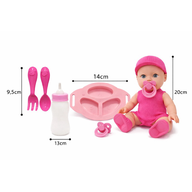 Boneca Bebê 20cm com chupeta /Kit Alimentação Completo – Mamadeira, Prato, Talheres e Chupet