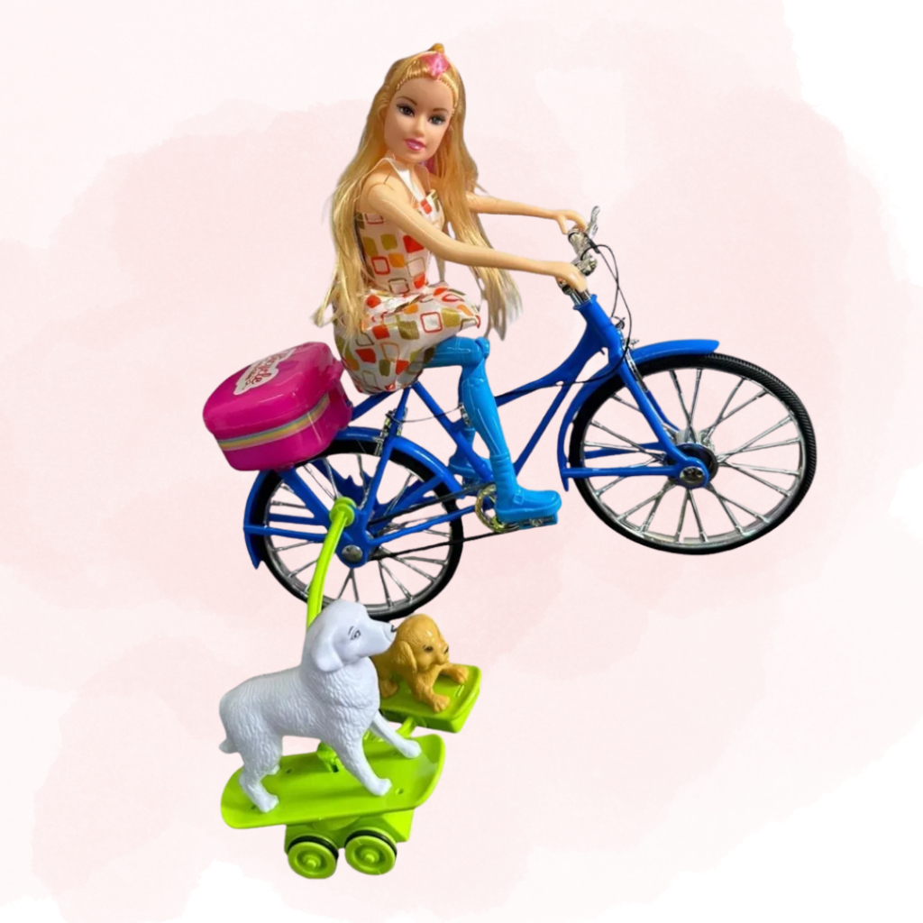 Boneca Ciclista Com Bicicleta E Cachorro Gira 360 Pedala Som Luz Infantil