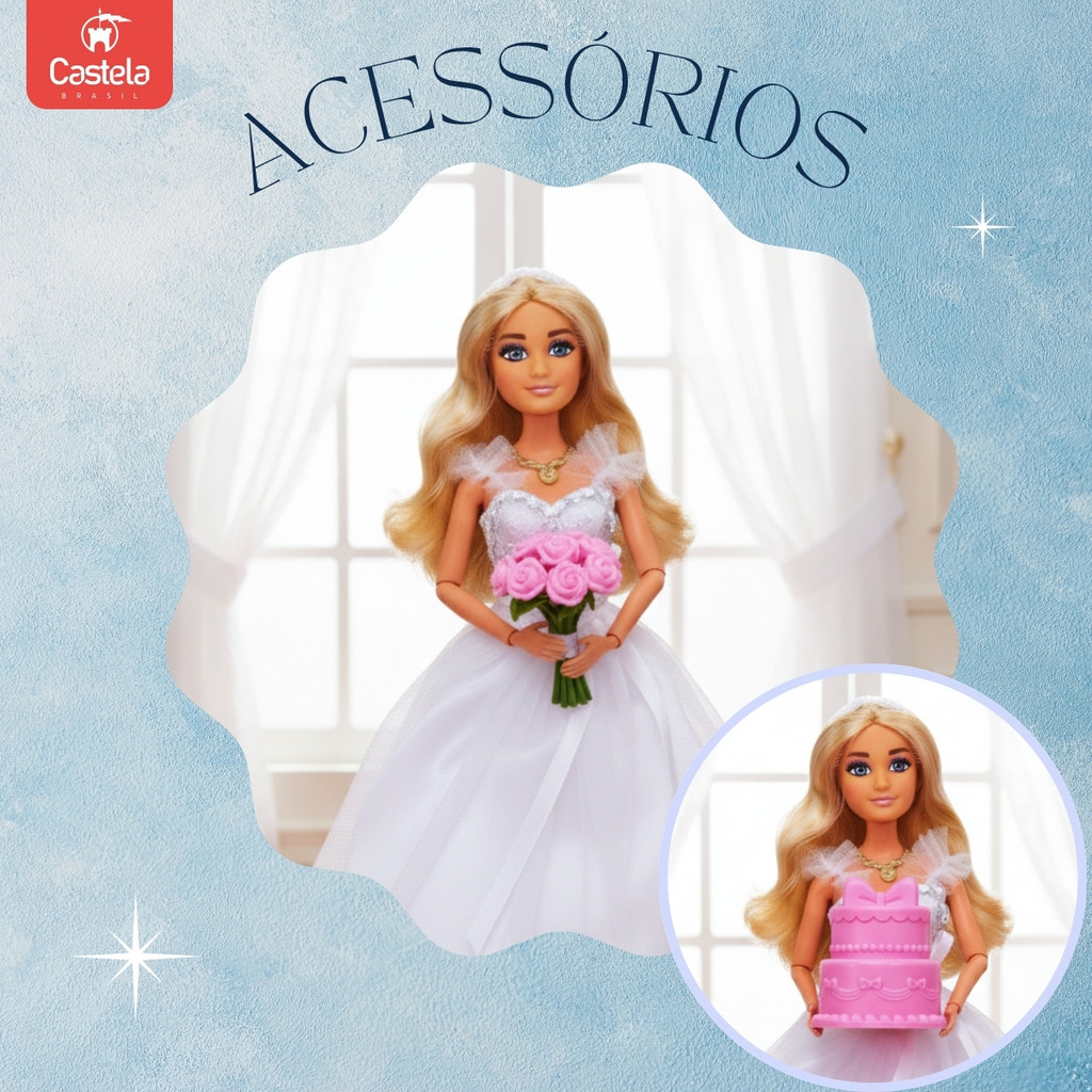 Boneca Coleção Vestido De Noiva Acessórios Buquê Flor Bolo - Castela