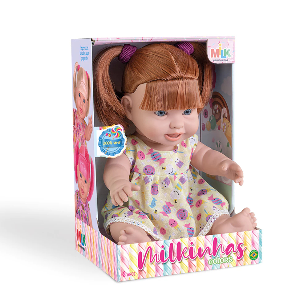 Boneca Milkinha Colors Grande 100% Vinil Super Macia Milk Brinquedos Boneca 100% vinil, lavavél, vem com uma roupinha super fofa, toda colorida, com um tecido fininho e delicado, possui 4 cores difenretes de cabelo para você colecionar. ESPECIFICAÇÕES DO PRODUTO: Idade recomendada: +3anos Dimensões de embalagem: Comprimento: 18cm Altura: 26cm Tamanho aproximado (altura) da boneca: 22cm As cores do tecido ou desenhos do produto podem variar de acordo com o lote de fabricação.