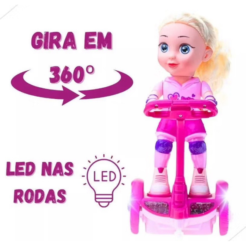 Boneca Com Patinete Hoverboard Giratório Som Luz Bate Volta Brinquedo Girl Presente De Natal
